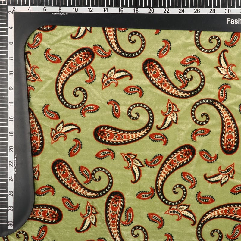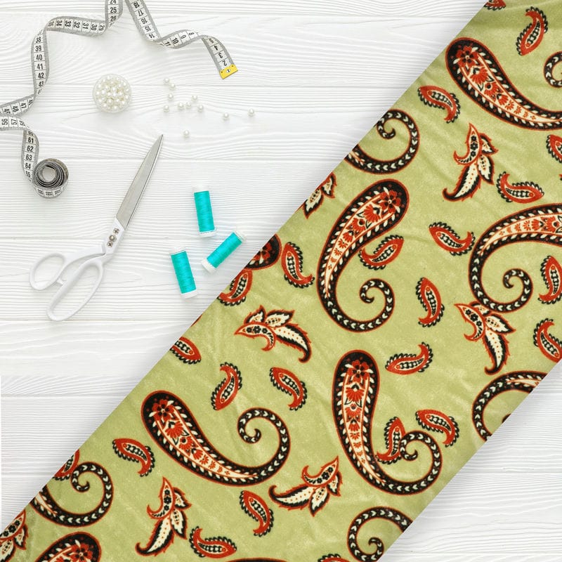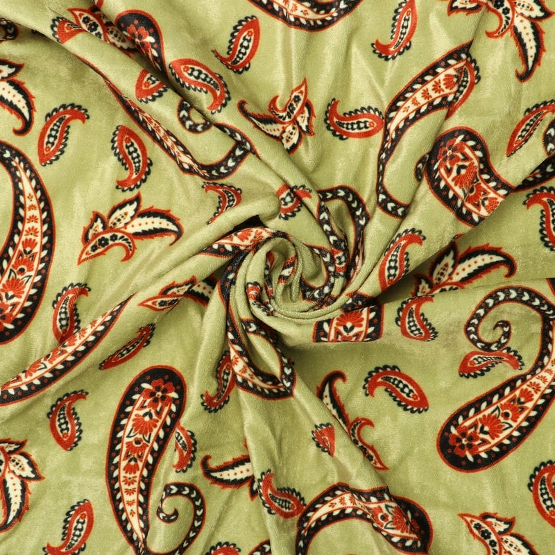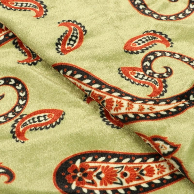 Olive Green And Dark Orange Paisley Pattern Digital Print Velvet Fabric