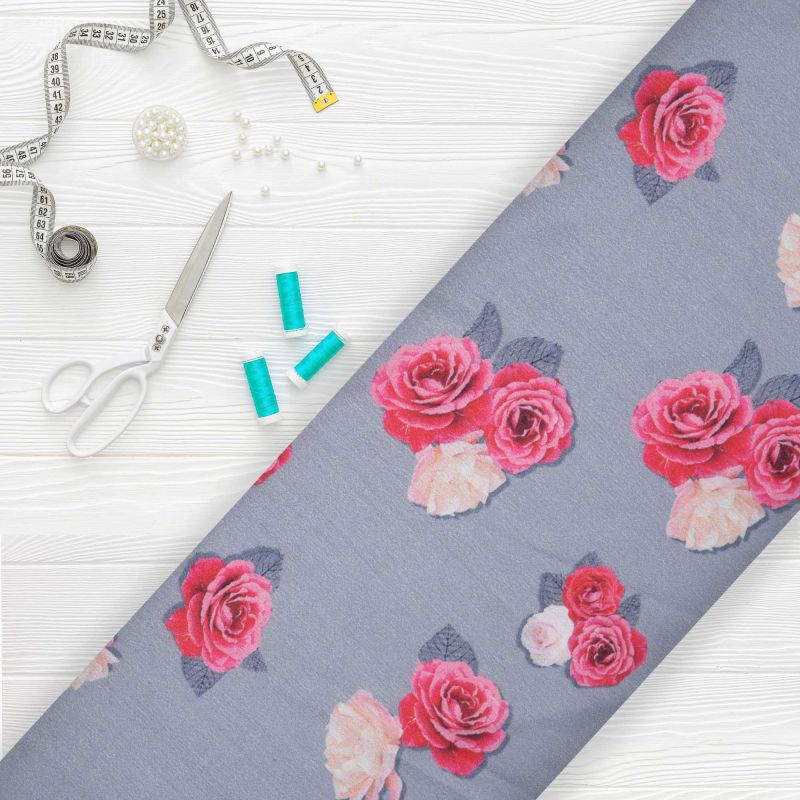 Greyish Blue And Deep Pink Floral Pattern Digital Print Chinon Chiffon Fabric