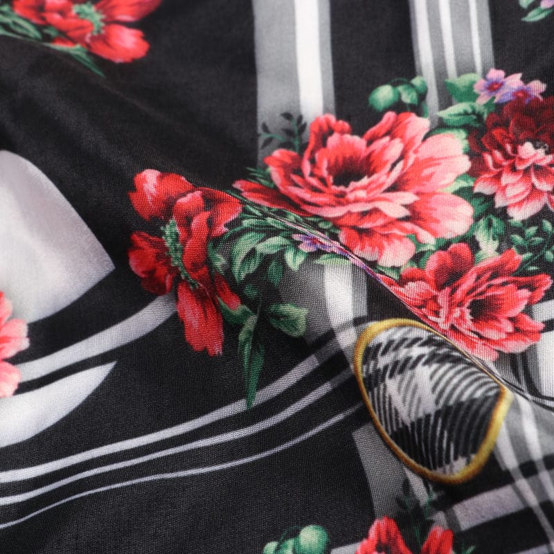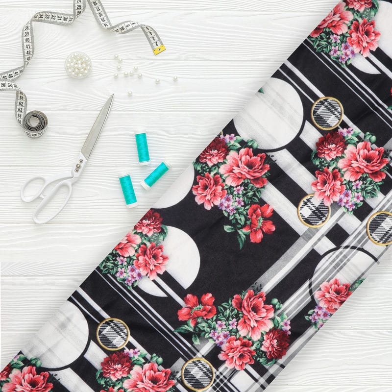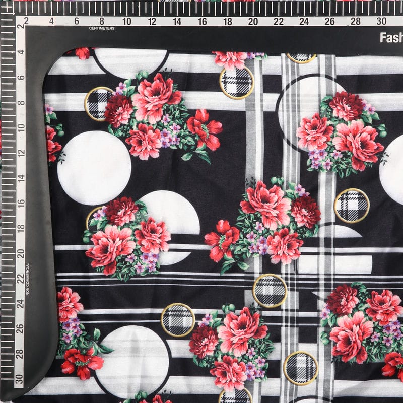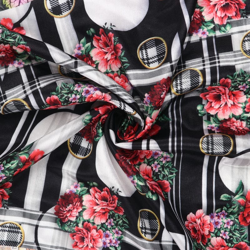 Black And Red Floral Pattern Digital Print Silk Crepe Fabric