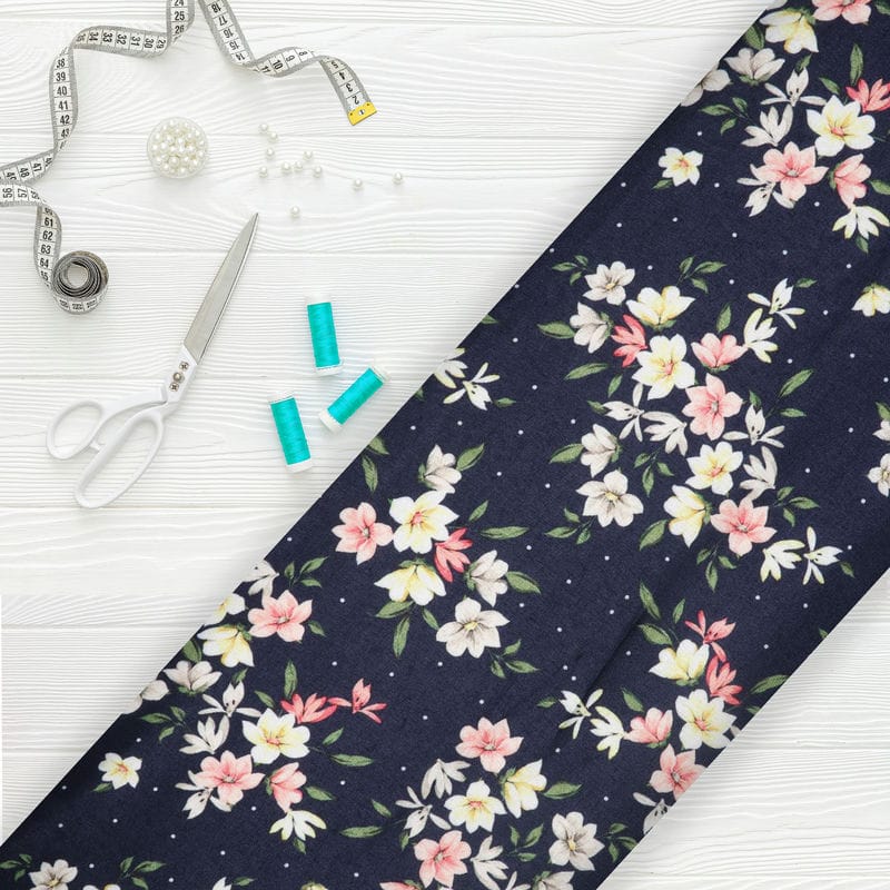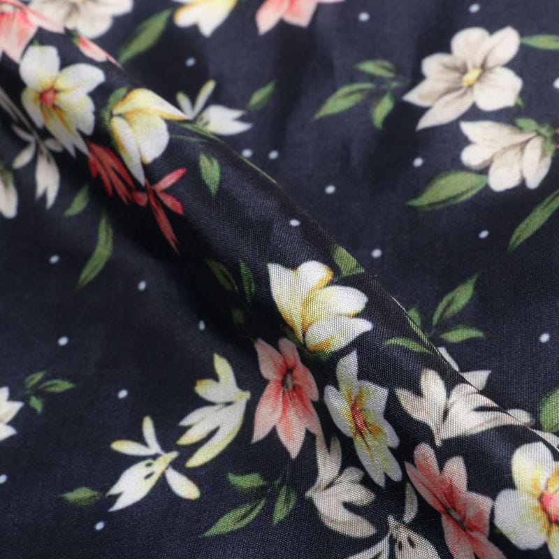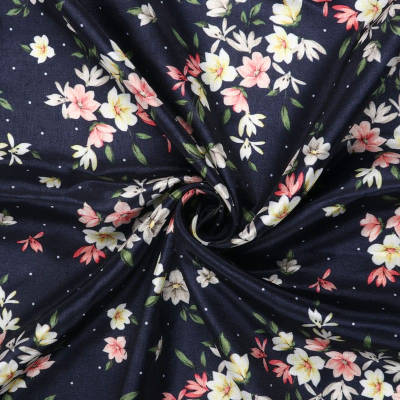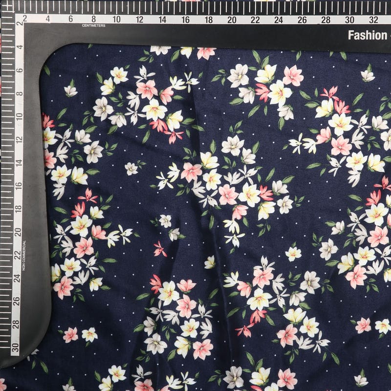 Dark Blue And White Floral Pattern Digital Print Silk Crepe Fabric