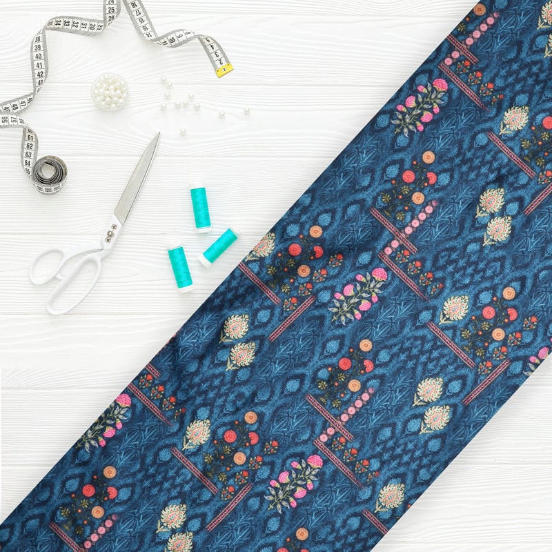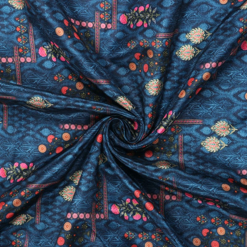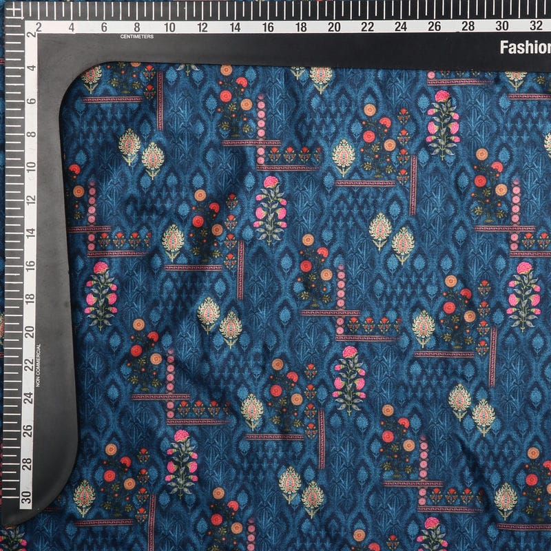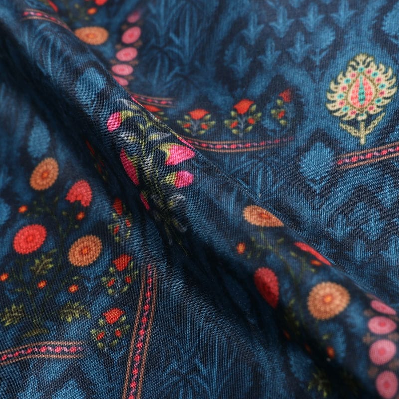 Navy Blue And Pink Floral Pattern Digital Print Silk Crepe Fabric