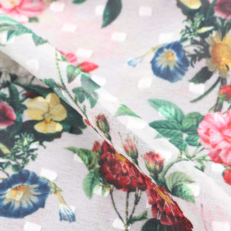 Georgette Dobby fabric is a type of polyester fabric that has a distinctive dobby weave, giving it a textured appearance. It is often printed with digital designs, which provides sharp and vibrant prints. This fabric is lightweight, durable, and easy to care for, making it a popular choice for clothing and home decor items. It has a slightly sheer appearance, drapes well, and has a soft, flowing feel.