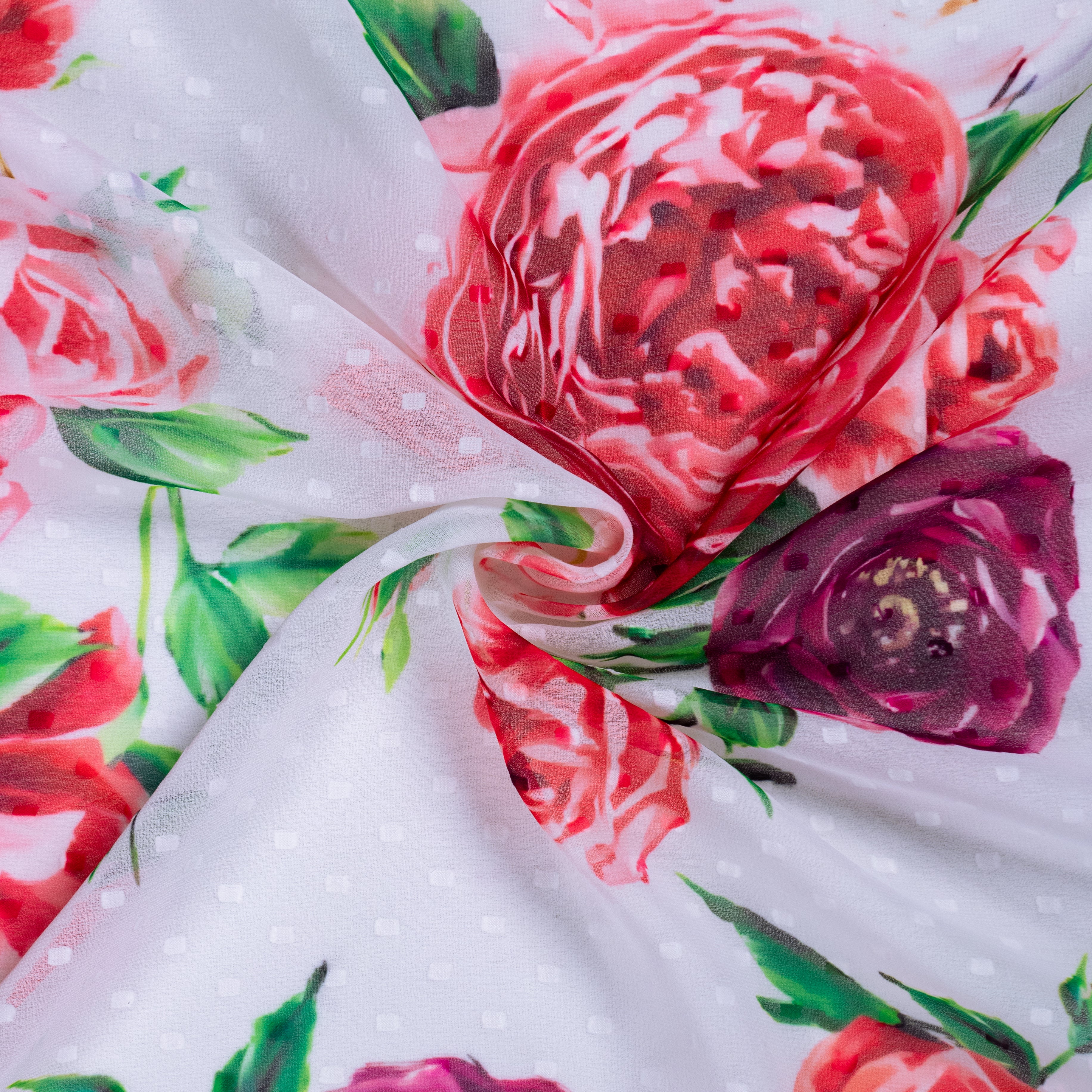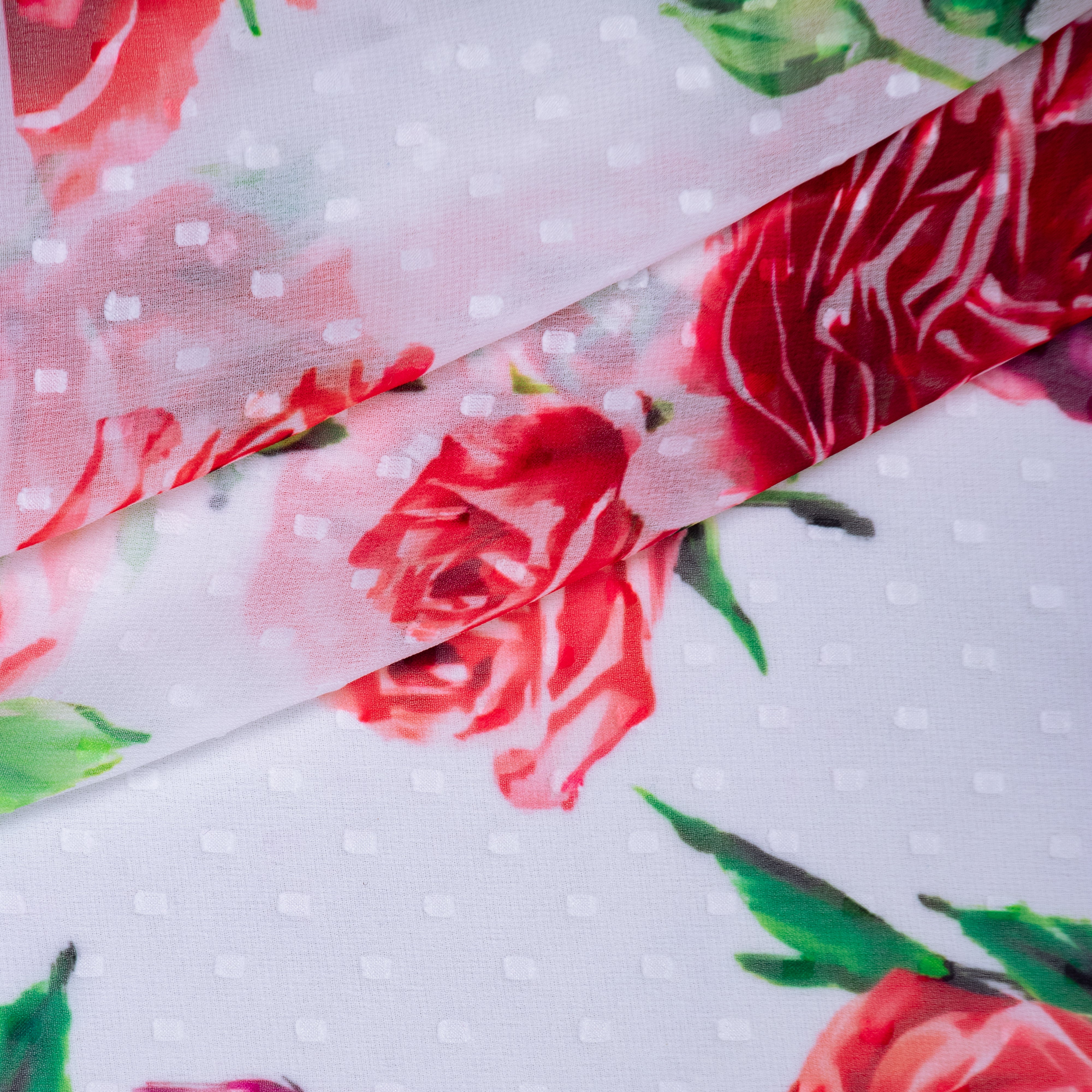 Red Rose and White Floral Pattern digital Print Georgette Dobby Fabric