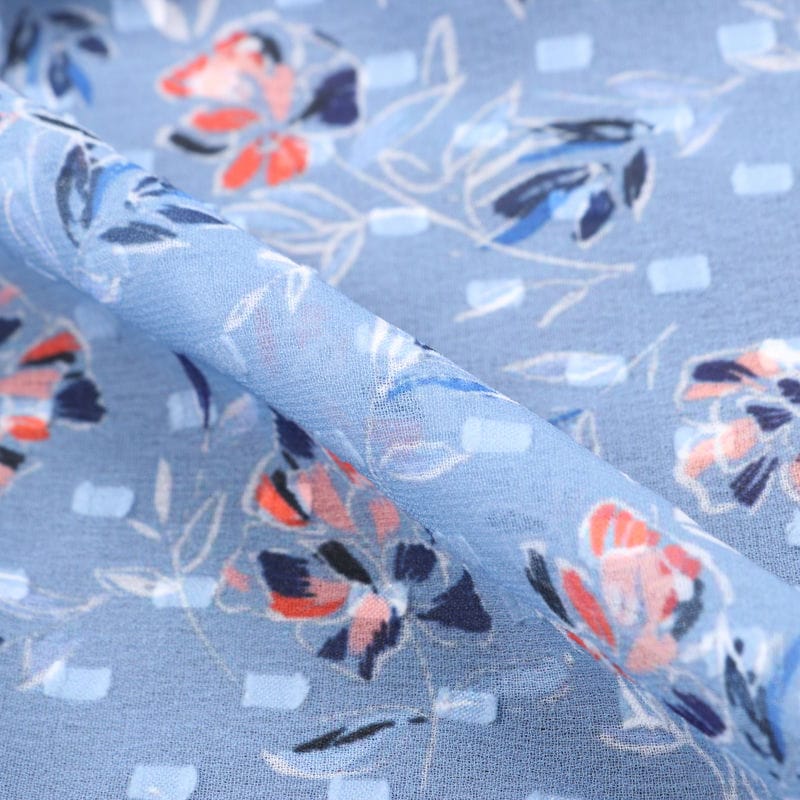 Georgette Dobby fabric is a type of polyester fabric that has a distinctive dobby weave, giving it a textured appearance. It is often printed with digital designs, which provides sharp and vibrant prints. This fabric is lightweight, durable, and easy to care for, making it a popular choice for clothing and home decor items. It has a slightly sheer appearance, drapes well, and has a soft, flowing feel.