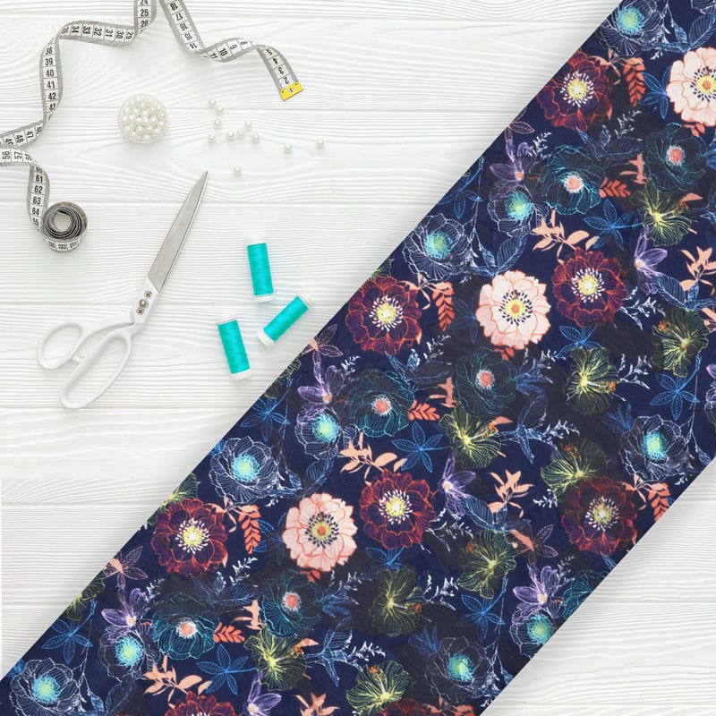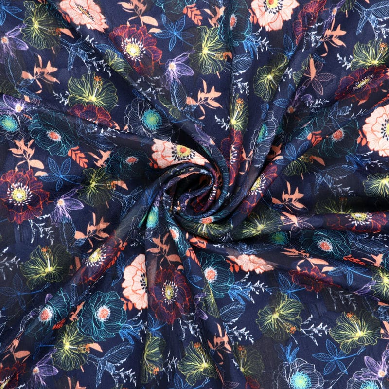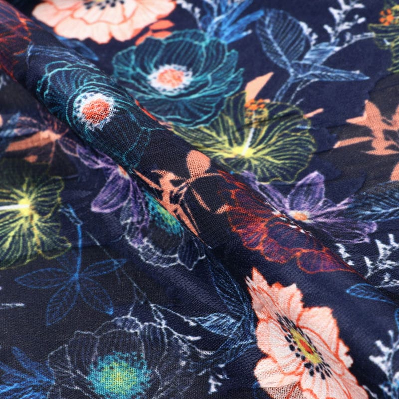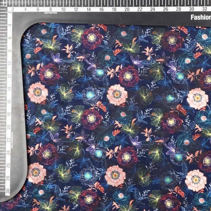 Blue And Orange Floral Pattern Digital Print Jacquard Georgette Fabric