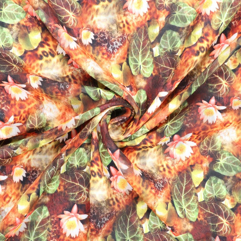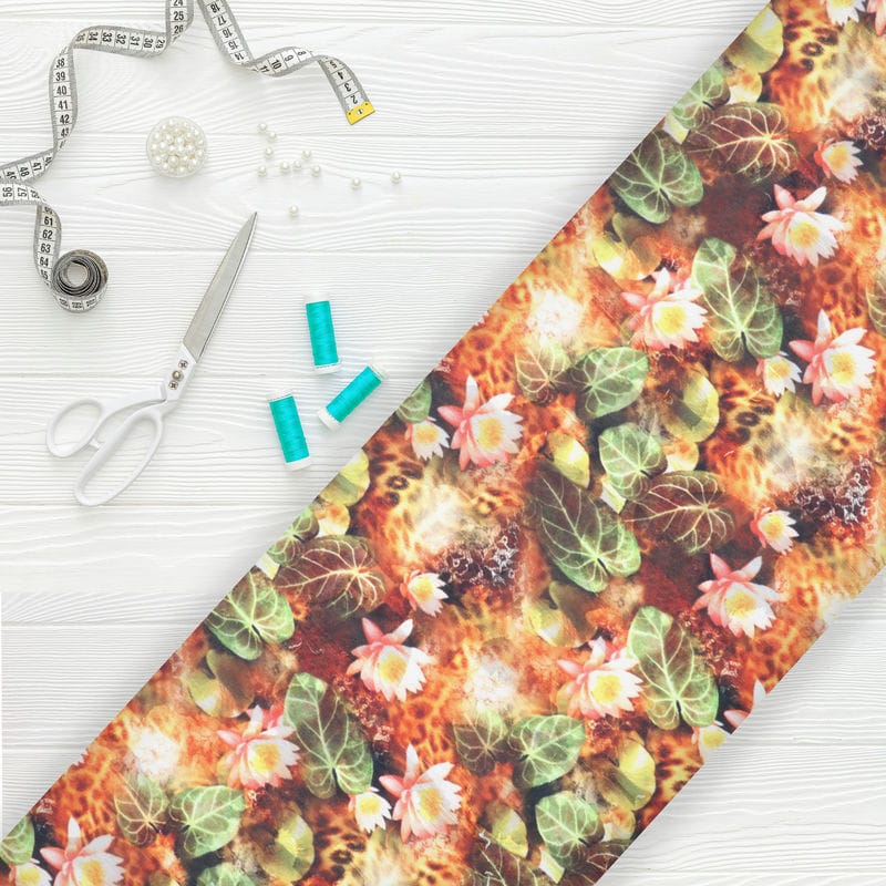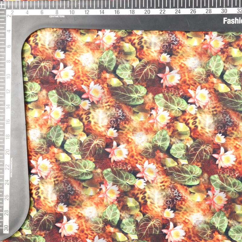 Orange And Green Floral Pattern Digital Print Jacquard Georgette Fabric