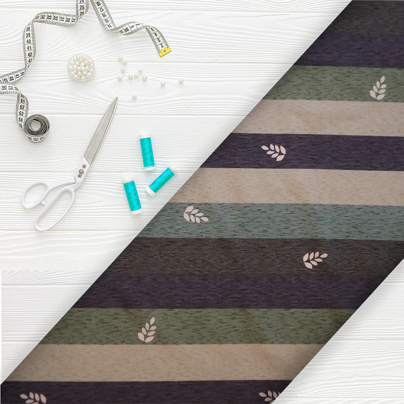 Multi Color Stripes With Small Leaf Pattern Digital Print Rayon Fabric.
