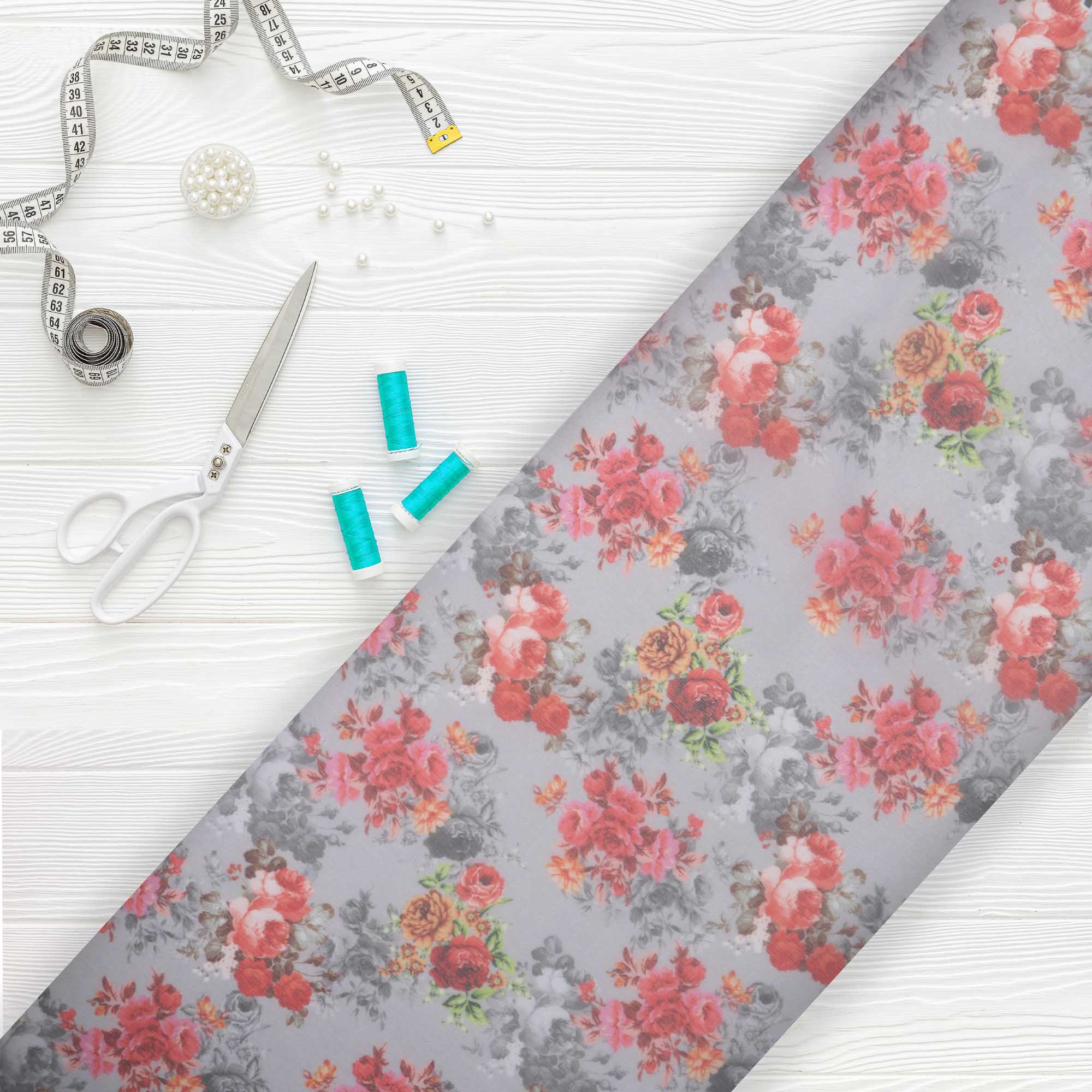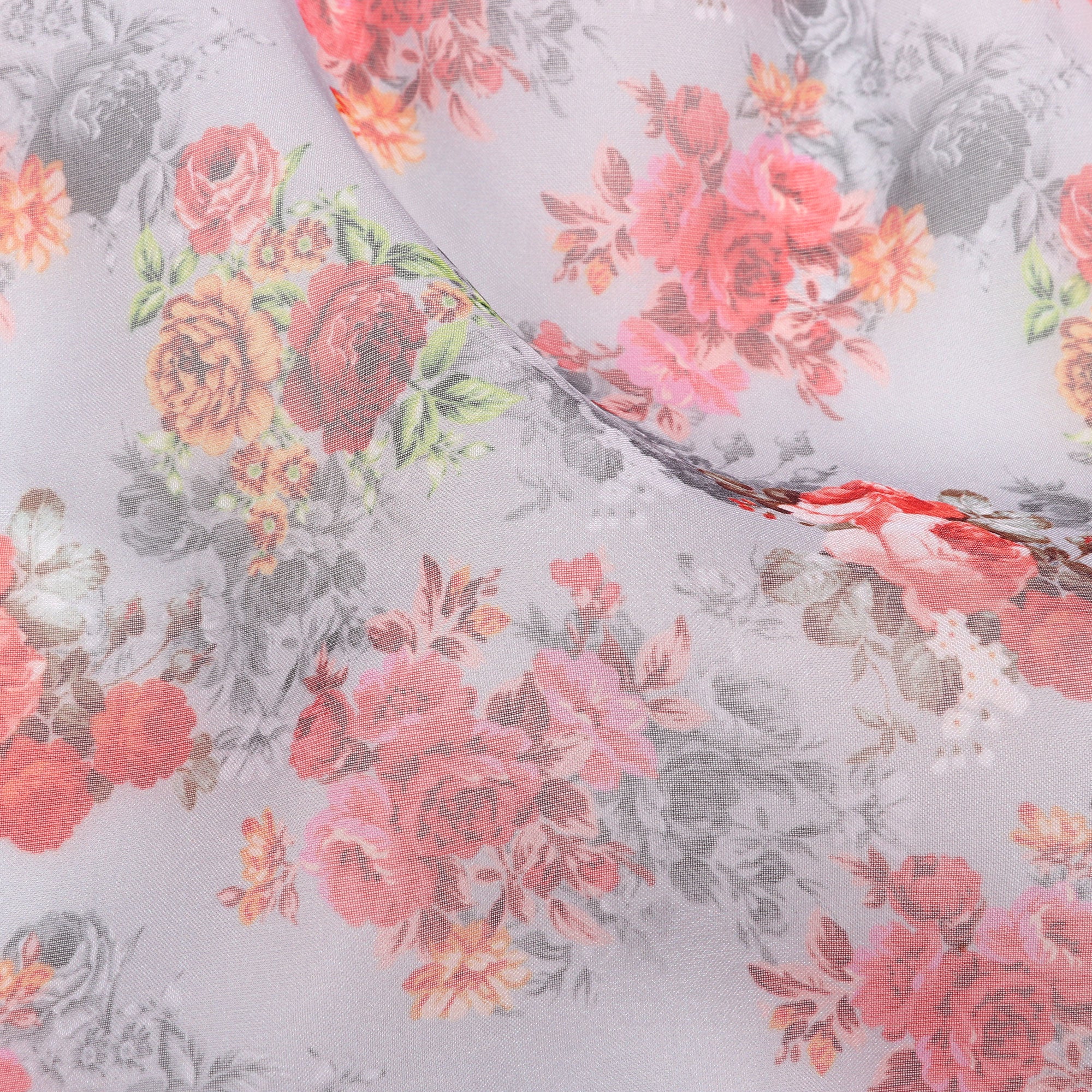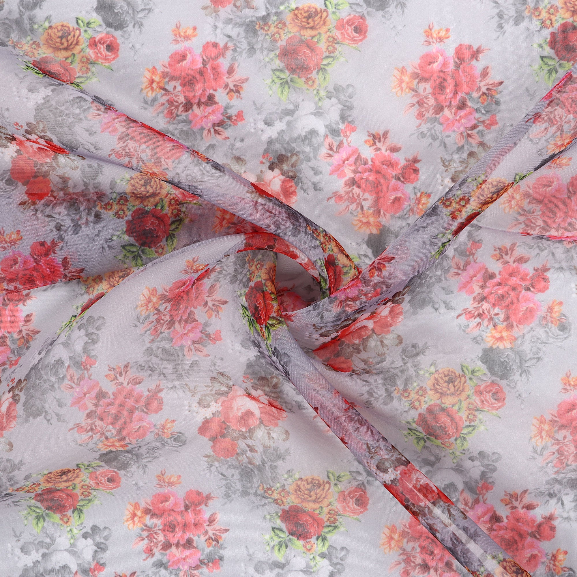 Grey And Red Floral Pattern Digital Print Organza Fabric