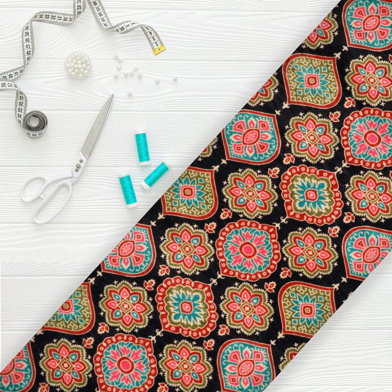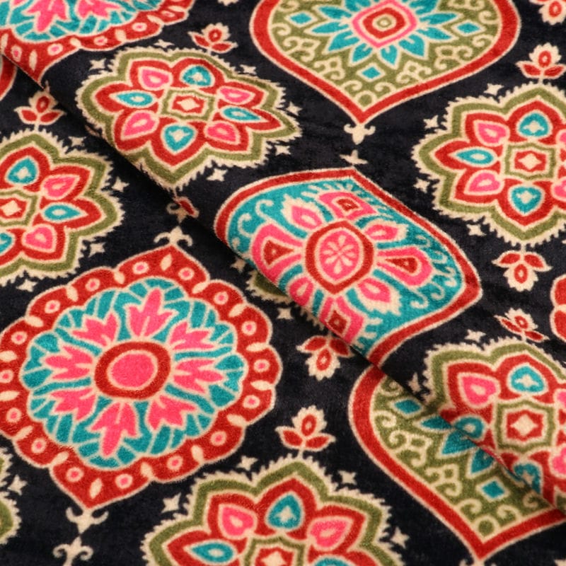 Dark Blue And Neon Pink Traditional Pattern Digital Print Velvet Fabric