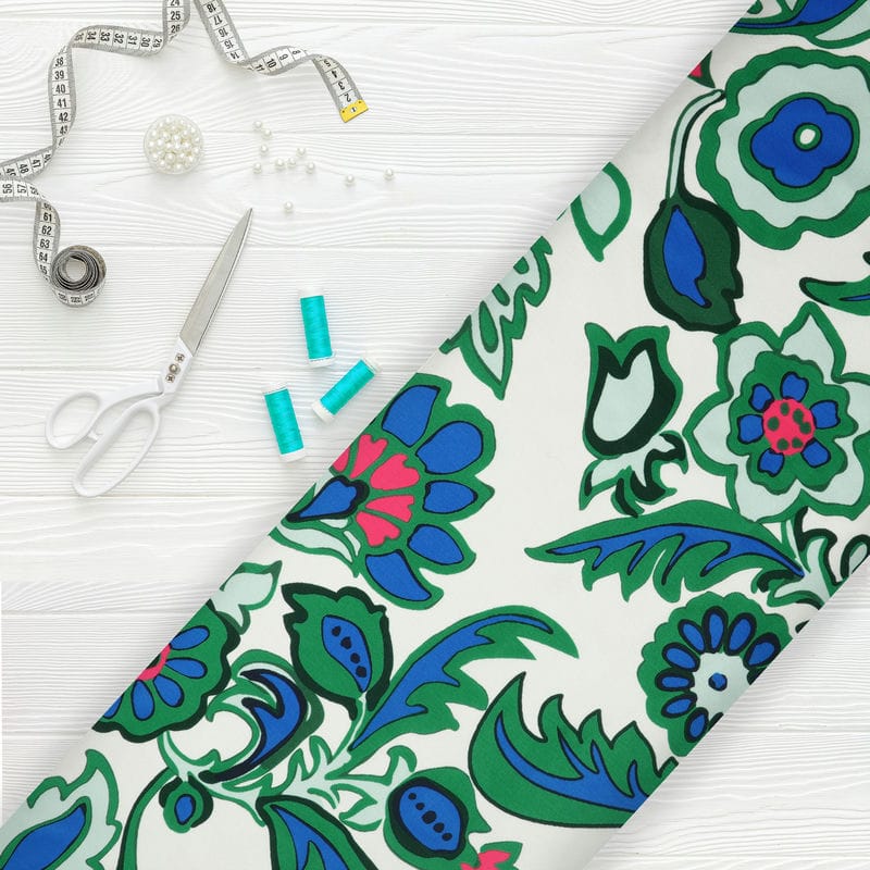 Blue And Off White Floral Pattern Digital Print Rayon Fabric