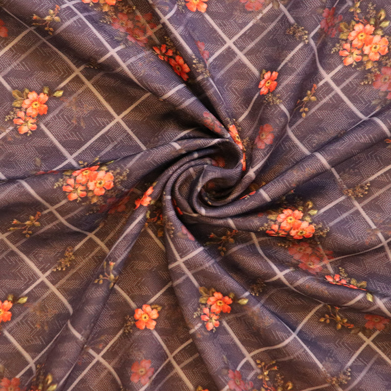 Blue And Pink Floral And Checks Pattern Digital Print Rayon Fabric.