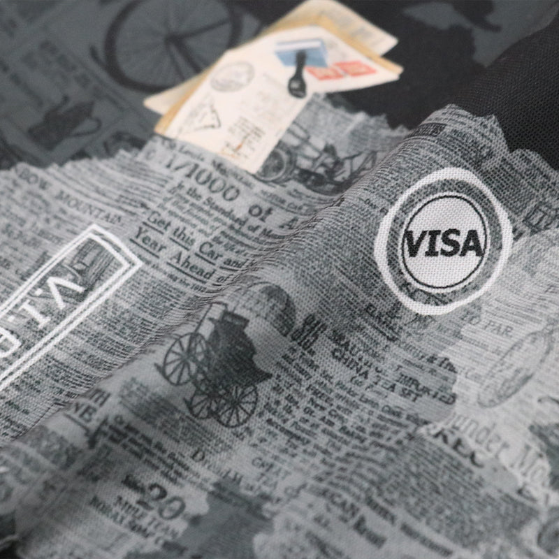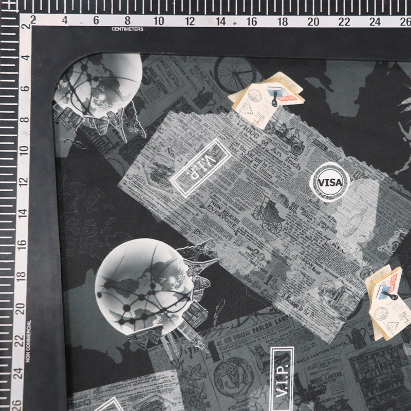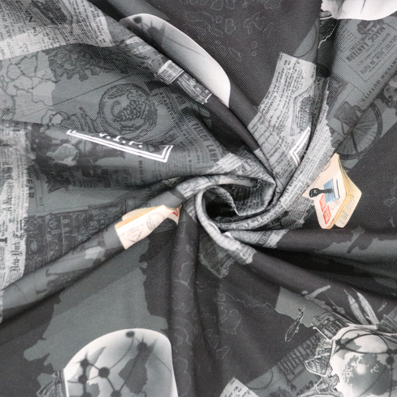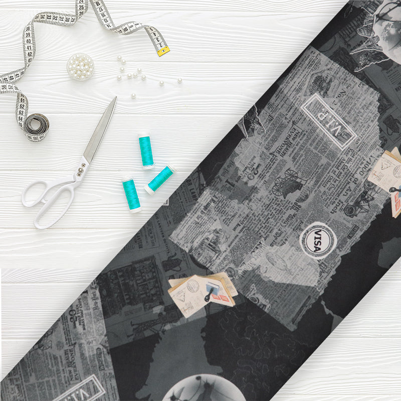 Grey And Beige Postcard Pattern Digital Print Rayon Fabric.