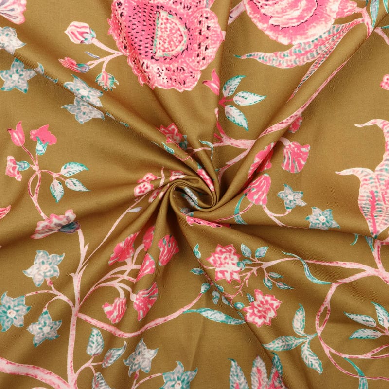 Khaki And Pink Floral Pattern Digital Print Rayon Fabric
