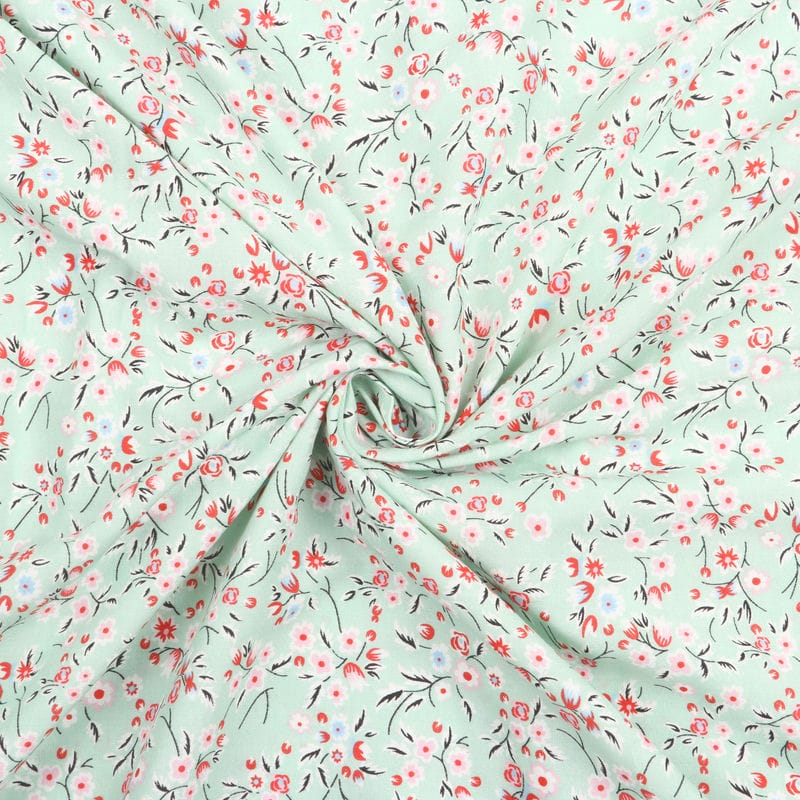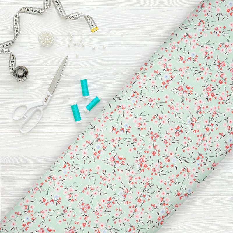 Mint Green And Red Floral Pattern Screen Print Rayon Fabric