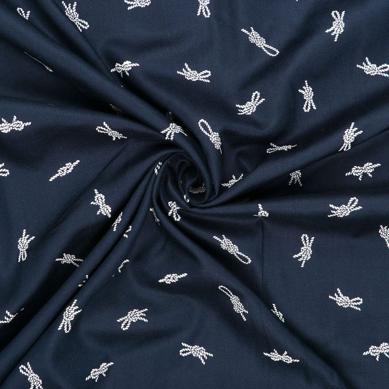 Navy Blue And White Knot Pattern Screen Print Rayon Fabric