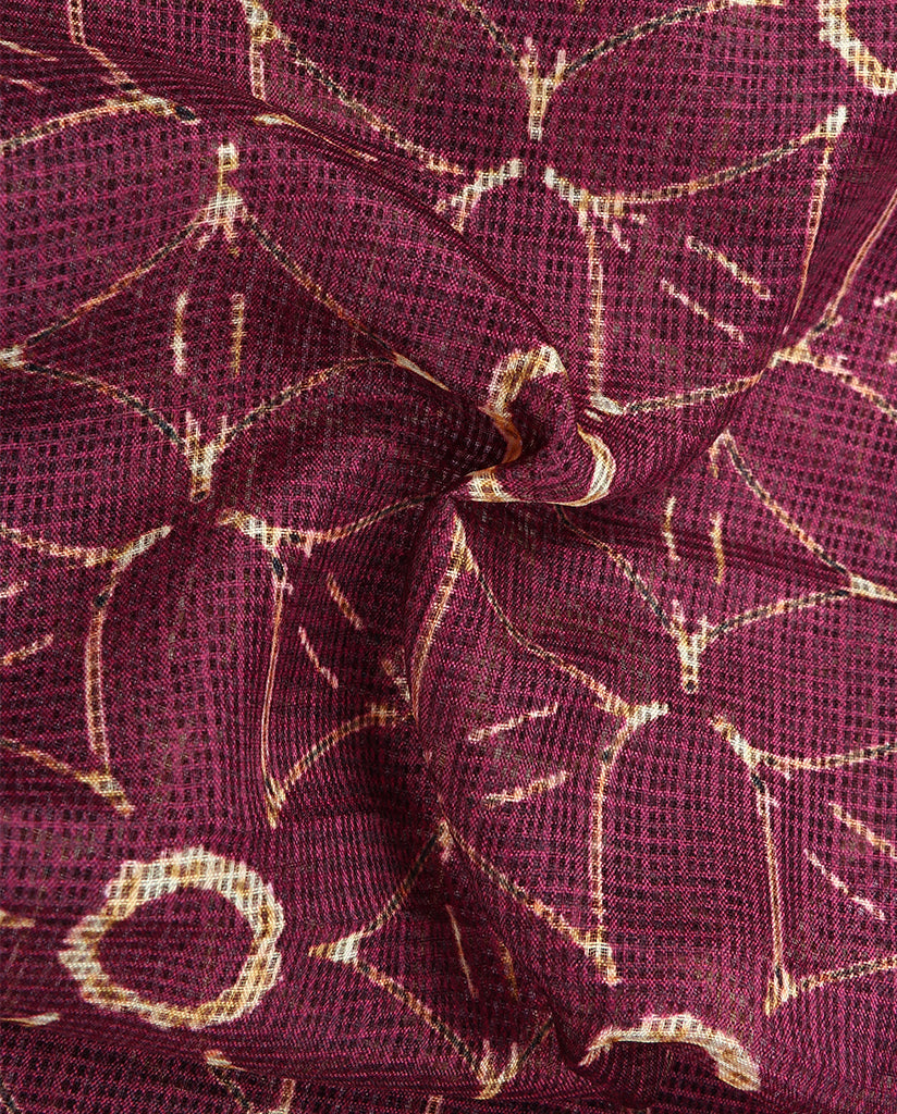 Dark Magenta And Yellow Floral Pattern Digital Print Kota Checks Saree With Blouse