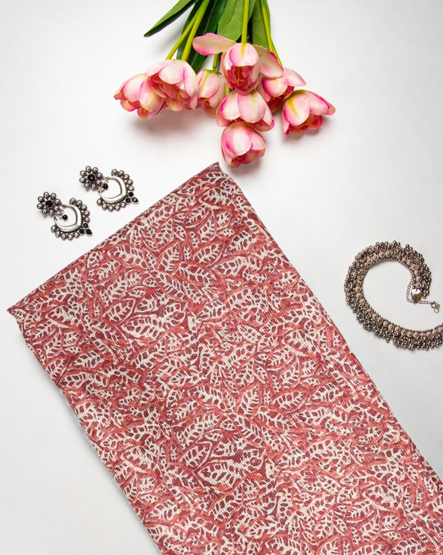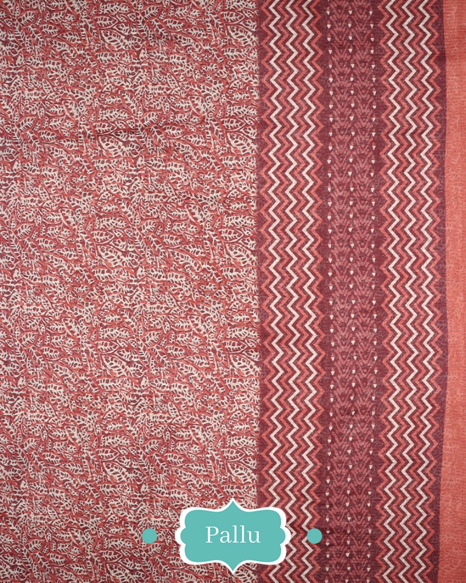 Orange And Cream Leaf Pattern Digital Print Kota Doria Saree With Blouse