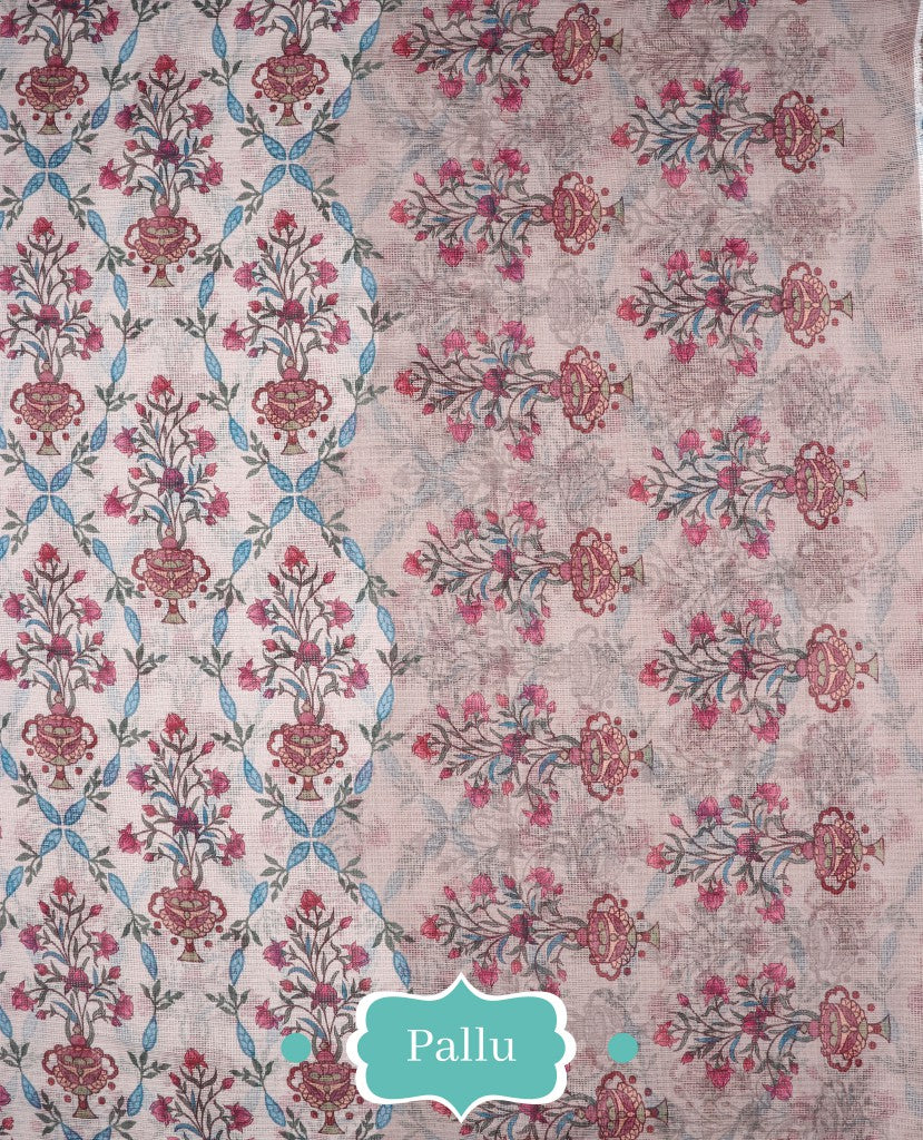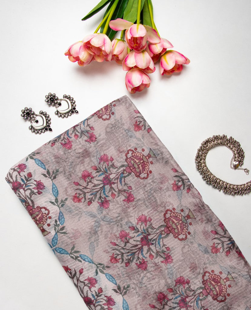 Tan Brown Floral Pattern Digital Print Kota Doria Saree With Blouse