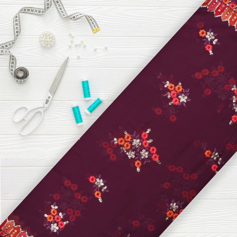 Fabmyntra’s Georgette embroidered fabric is an exquisite art of fine needlework to embellish and accentuate the fabric. Specially instilled for decorative and communicative purposes and also to add form, texture, color, richness, and dimension; you can utilize this fabric to style and design home furnishings, dresses, sarees, shirts, lehengas, traditional wear and much more.