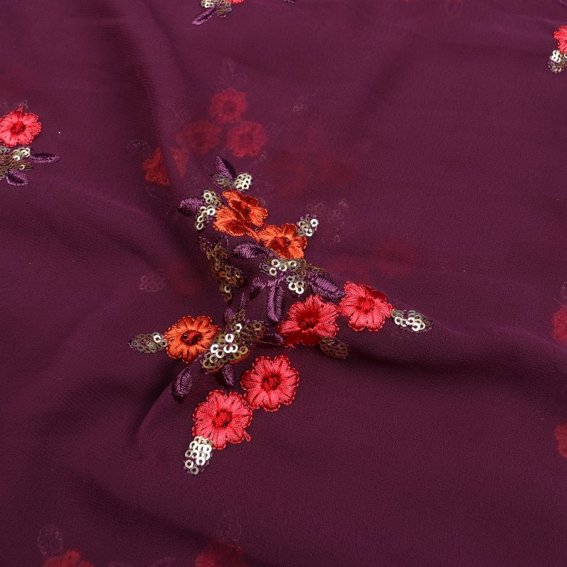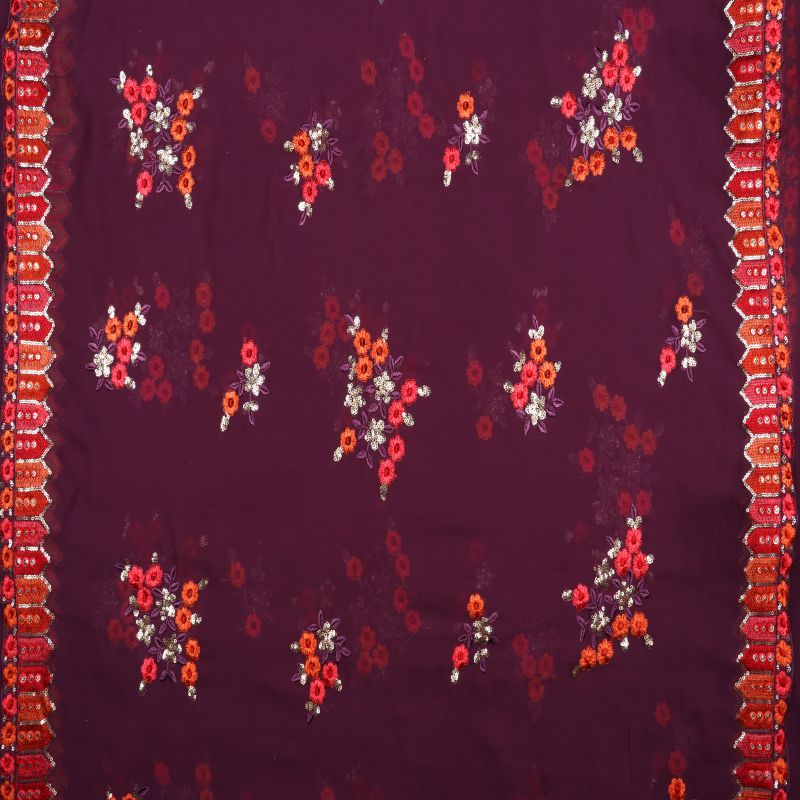 Dark Purple AndOrange Floral Pattern Dyed Sequins Embroidery Georgette Fabric