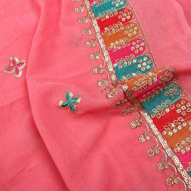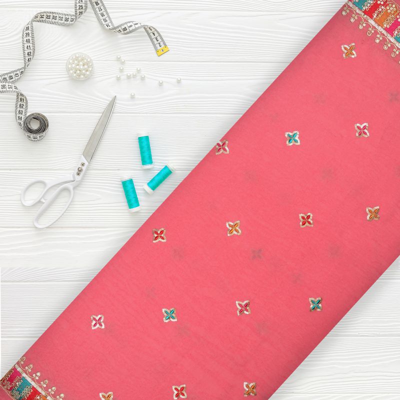 Fabmyntra’s Georgette embroidered fabric is an exquisite art of fine needlework to embellish and accentuate the fabric. Specially instilled for decorative and communicative purposes and also to add form, texture, color, richness, and dimension; you can utilize this fabric to style and design home furnishings, dresses, sarees, shirts, lehengas, traditional wear and much more.