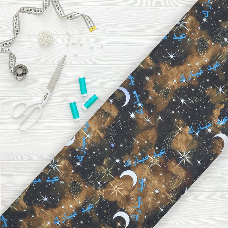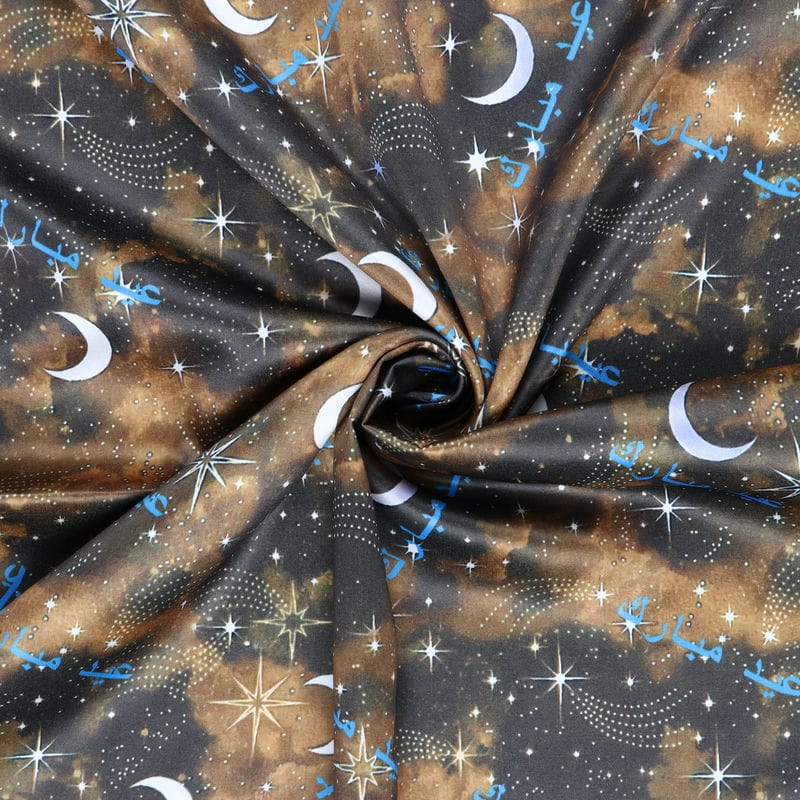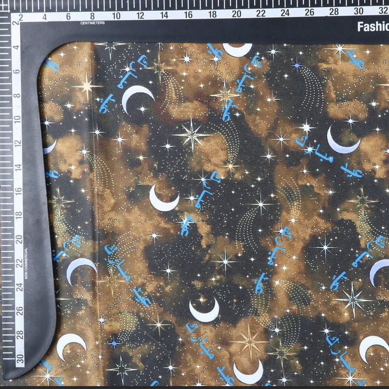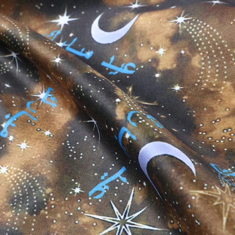 Golden Yellow And Brown Galaxy Pattern Digital Print Silk Satin Fabric