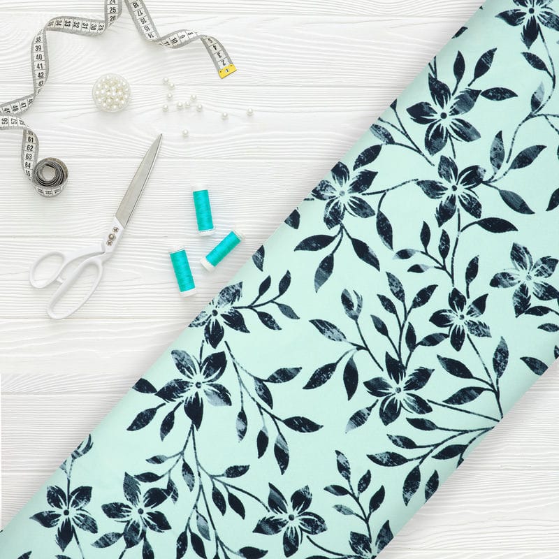 Light Sea Green And Black Floral Pattern Digital Print Silk Satin Fabric