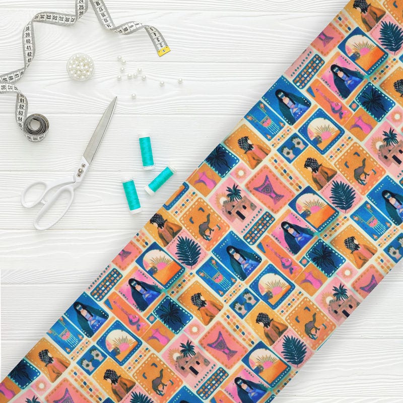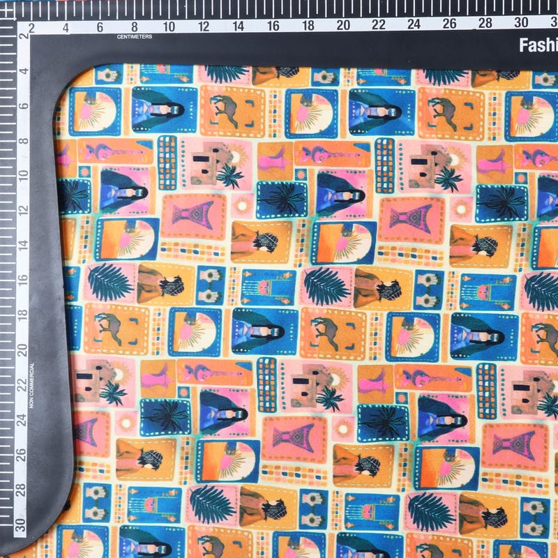 Mustard Yellow And Blue Block Pattern Digital Print Silk Satin Fabric