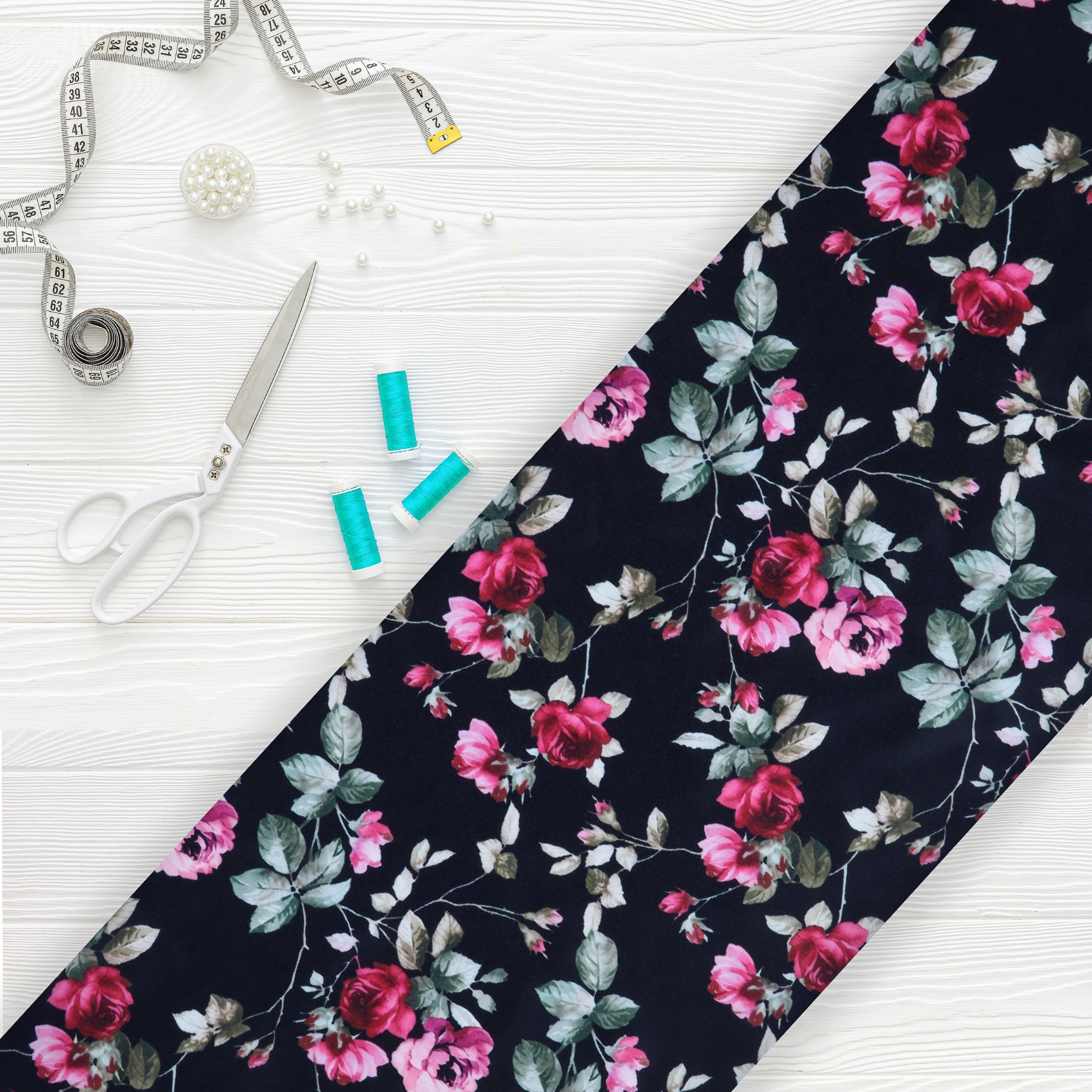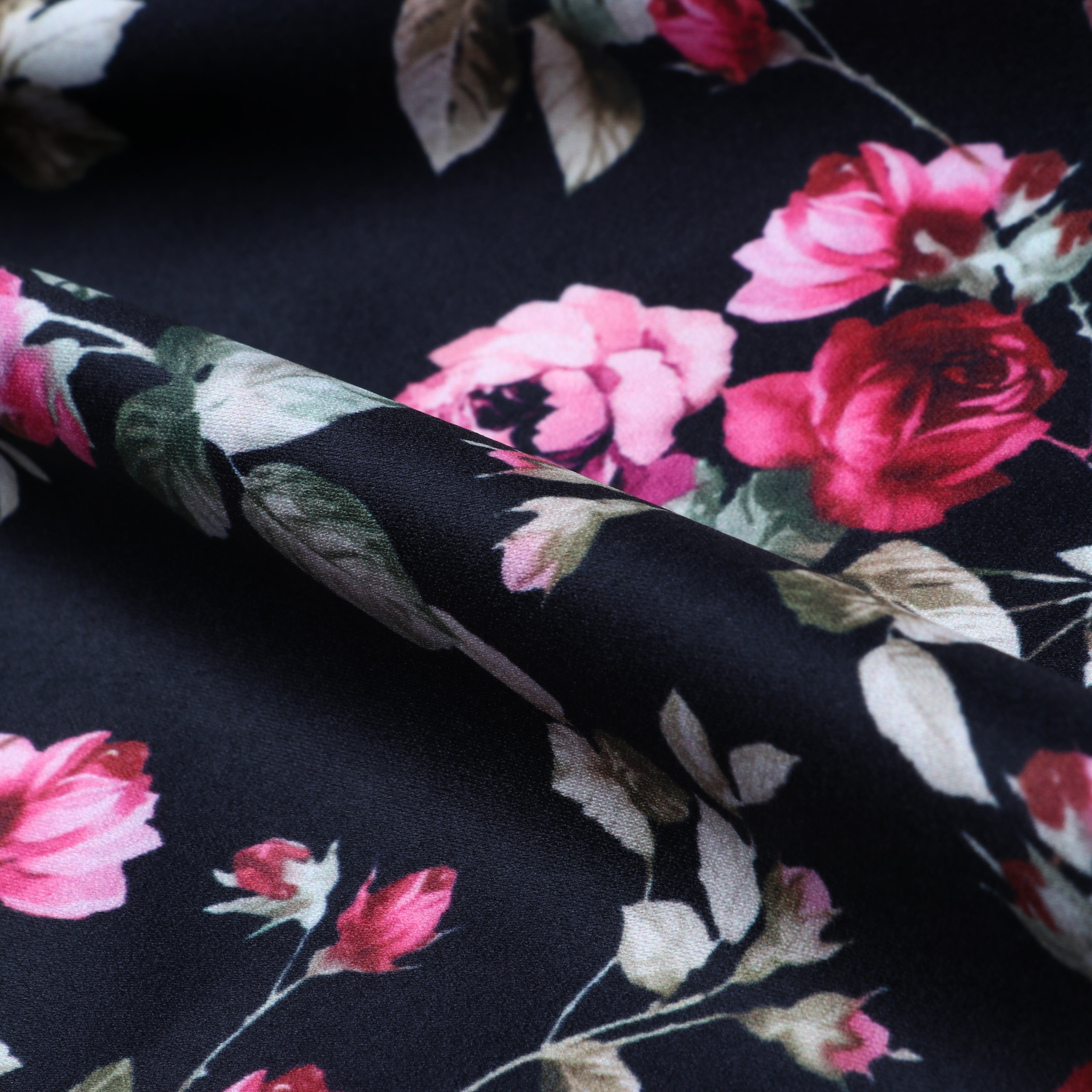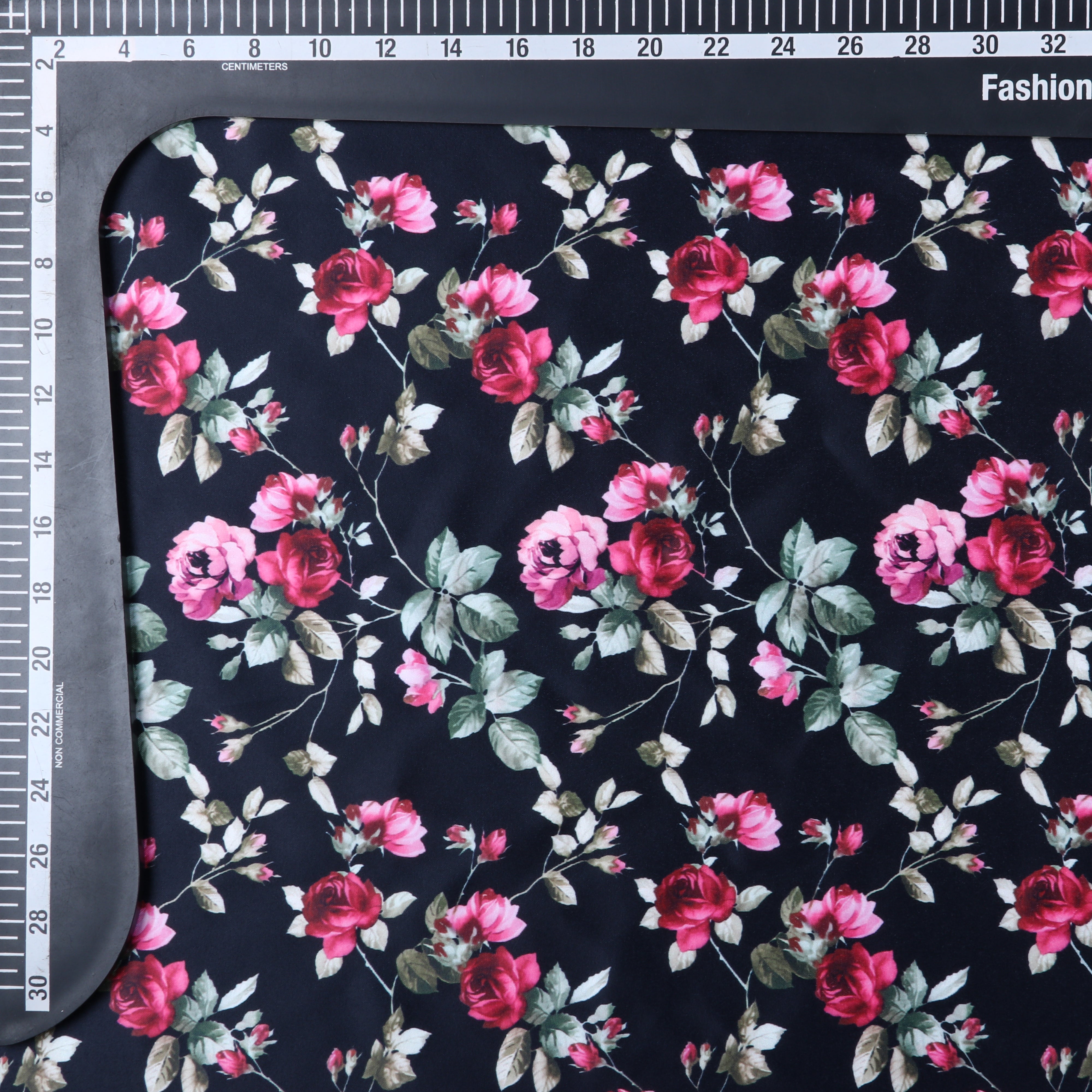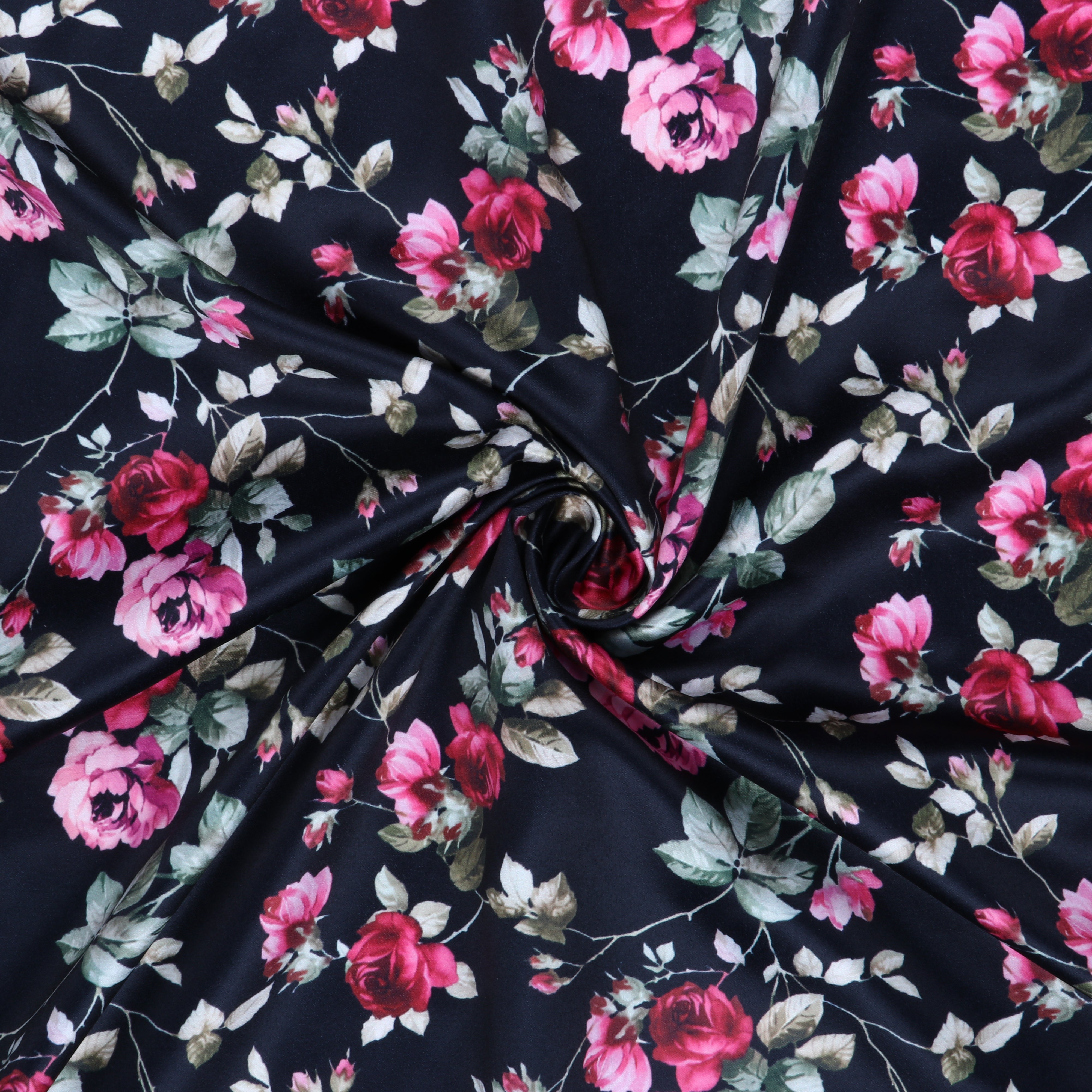 Pink And Black Floral Pattern Digital Print Silk Satin Fabric
