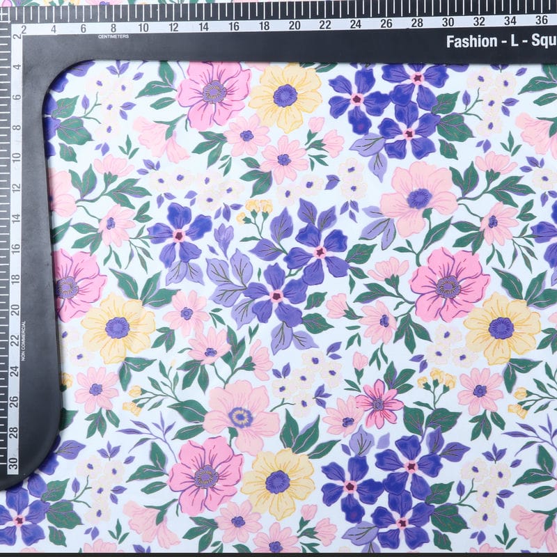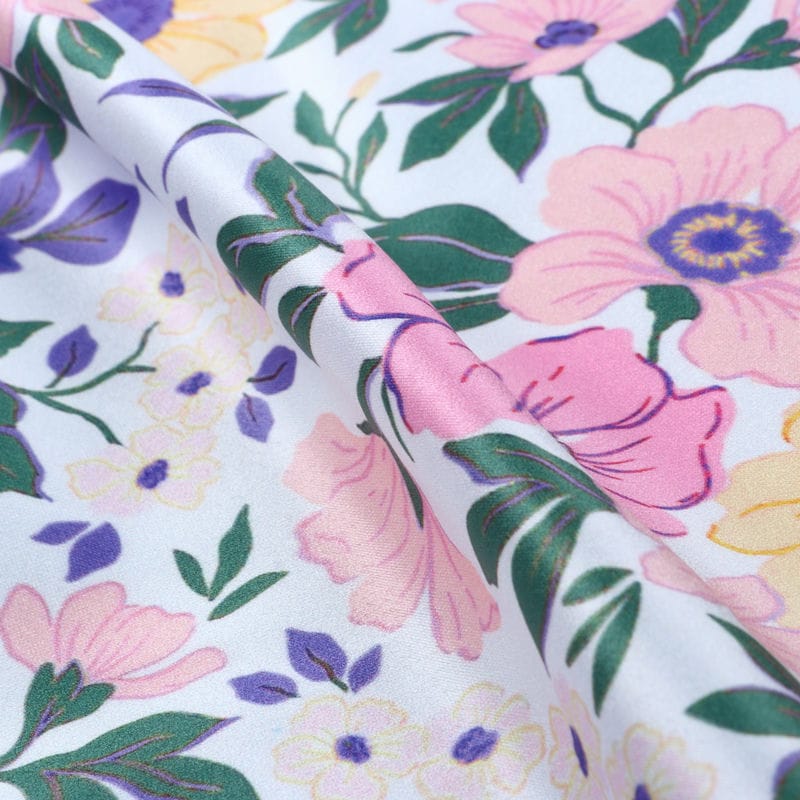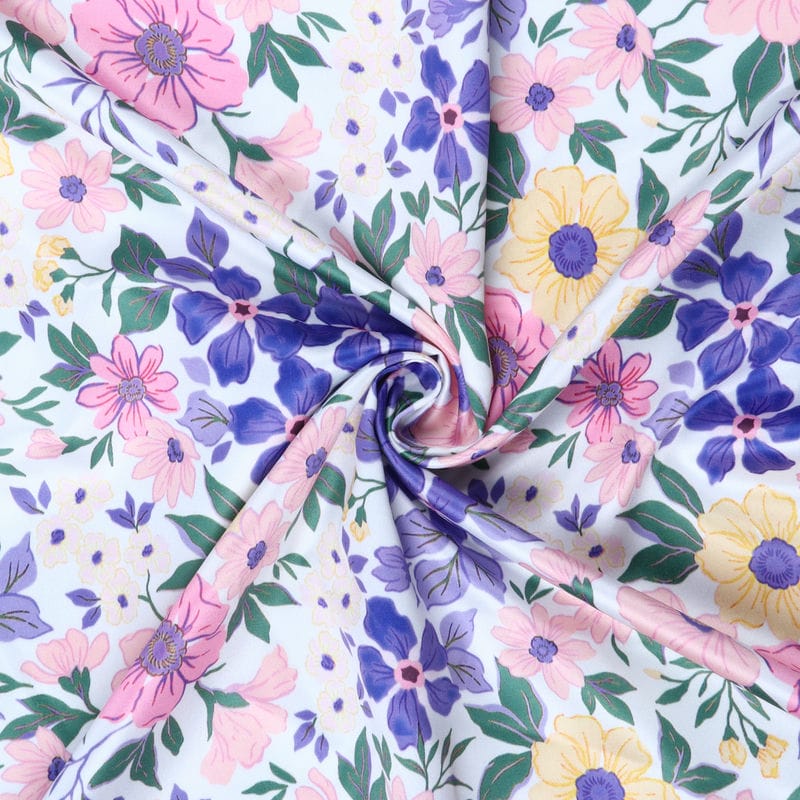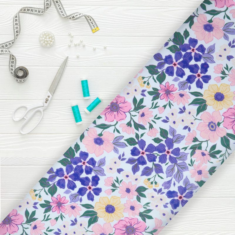 Pink And Blue Floral Pattern Digital Print Silk Satin Fabric
