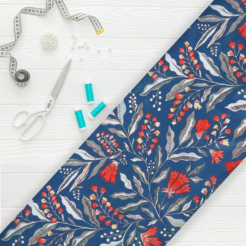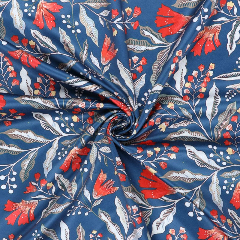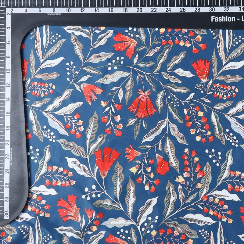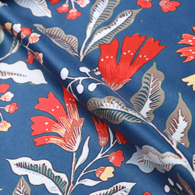 Steel Blue And Orange Floral Pattern Digital Print Silk Satin Fabric