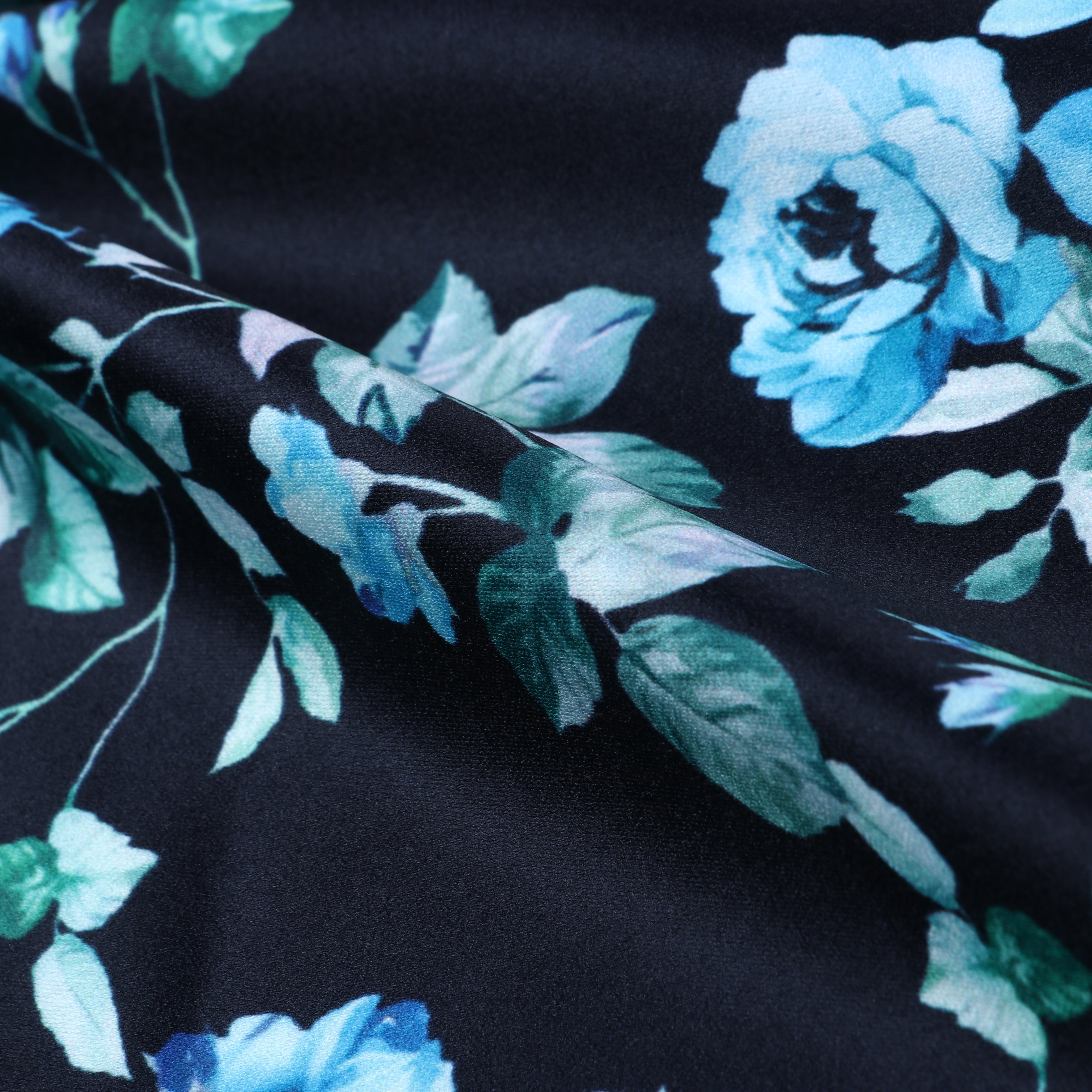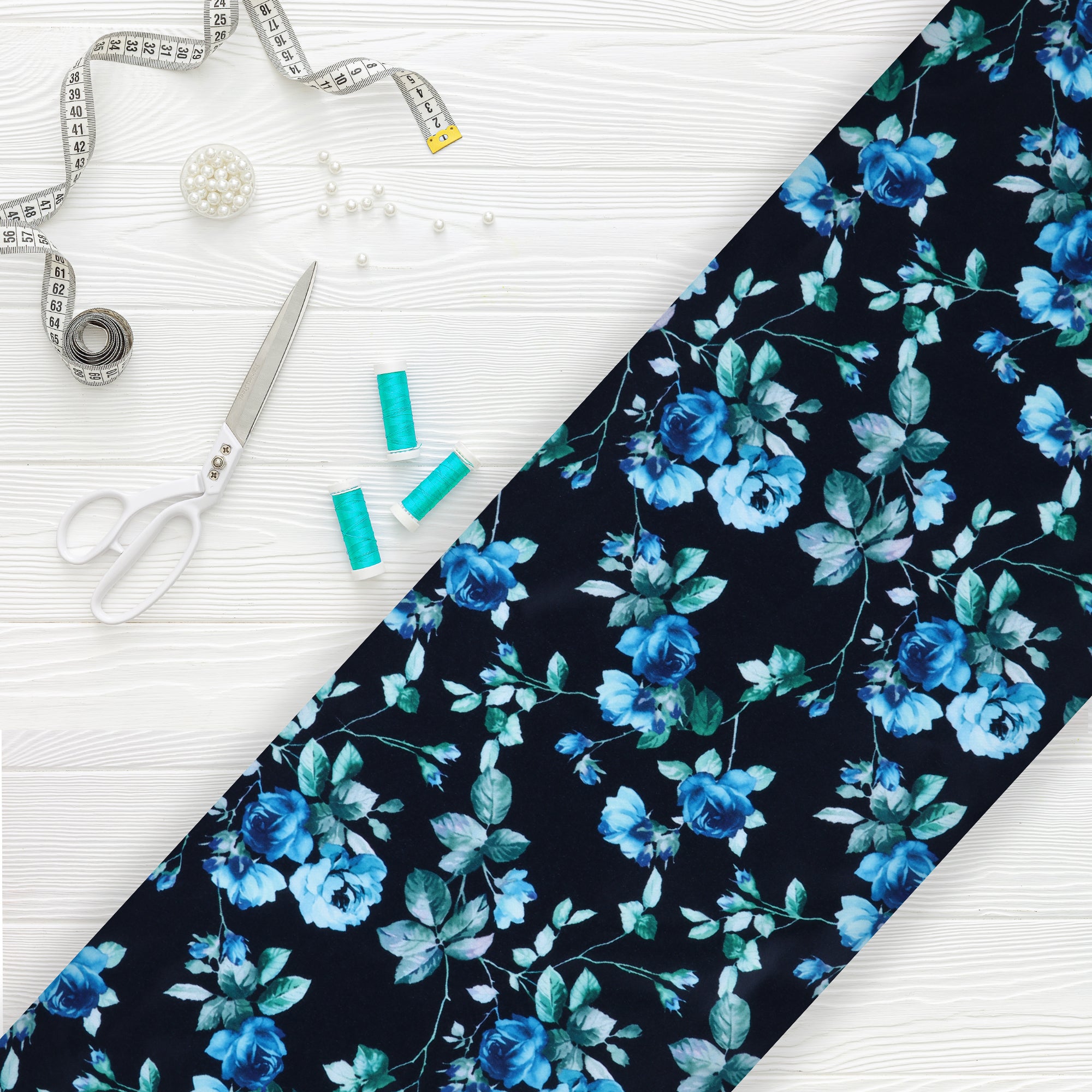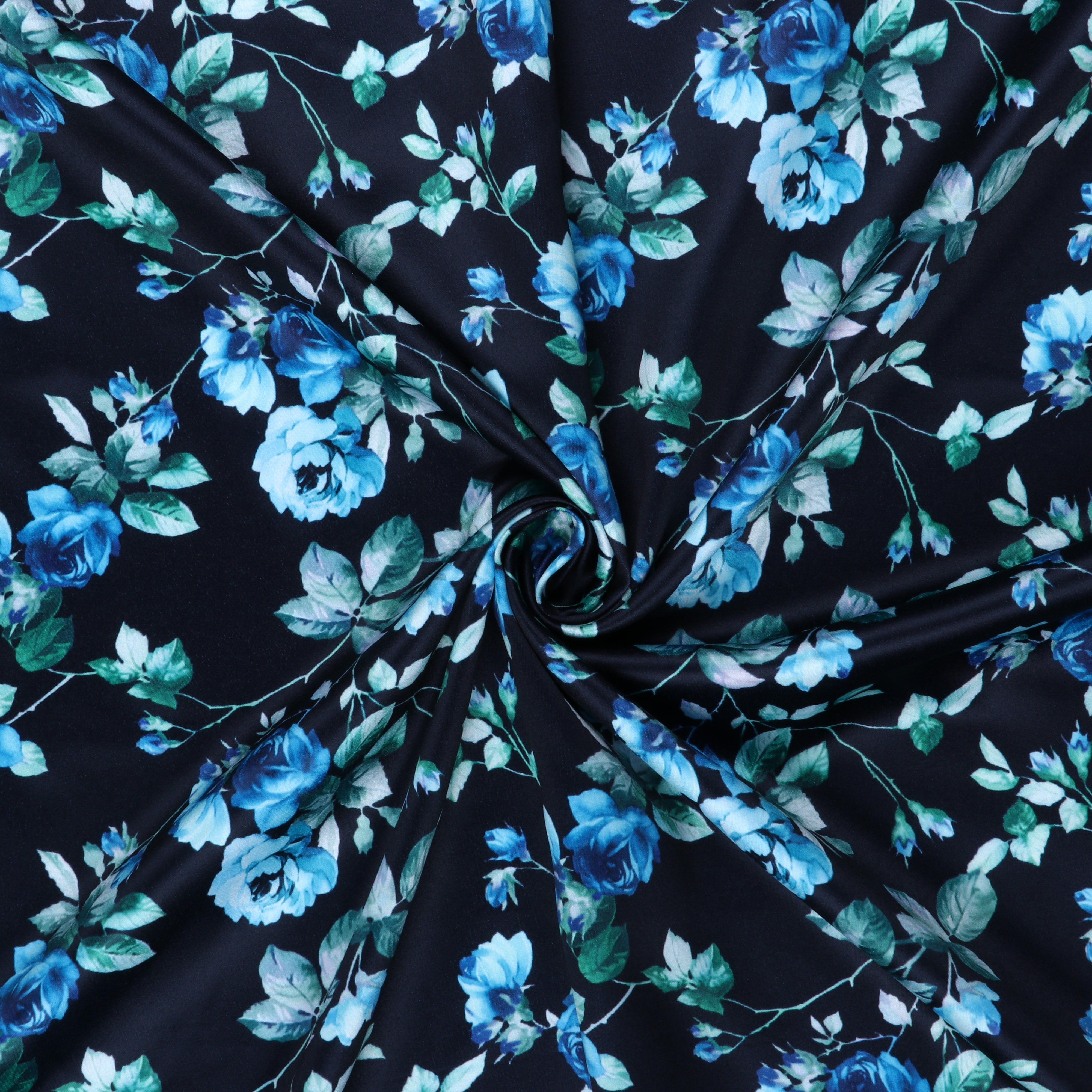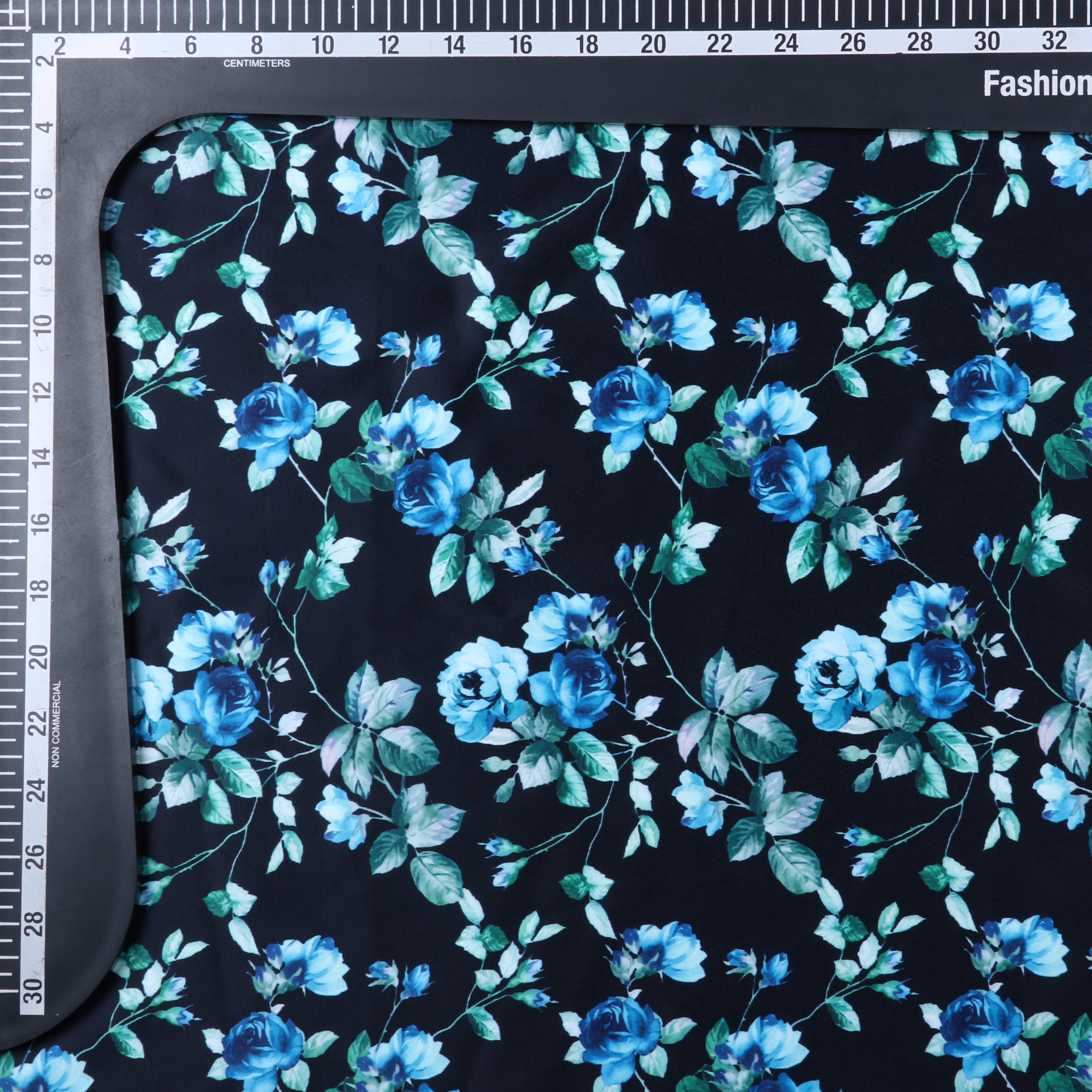 Turquoise And Black Floral Pattern Digital Print Silk Satin Fabric