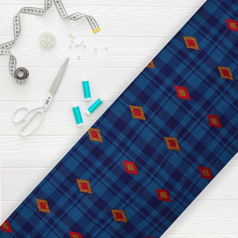 Dark Blue And Orange Checks Pattern Dyed Embroidery Cotton Fabric