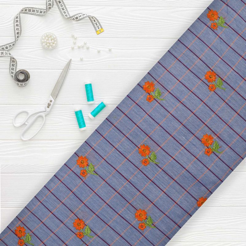Light Lavender And Orange Checks Pattern Dyed Embroidery Cotton Fabric