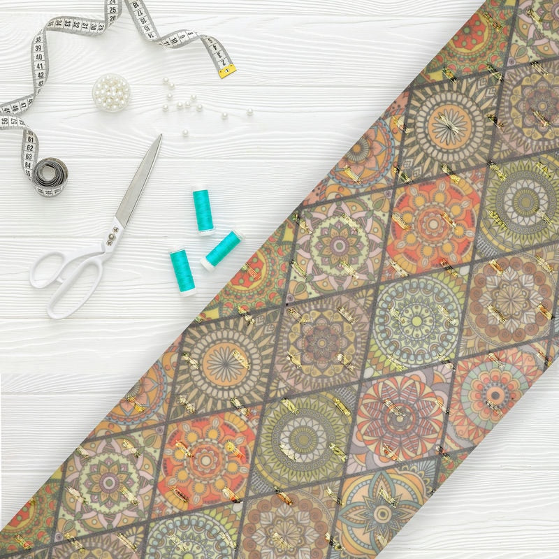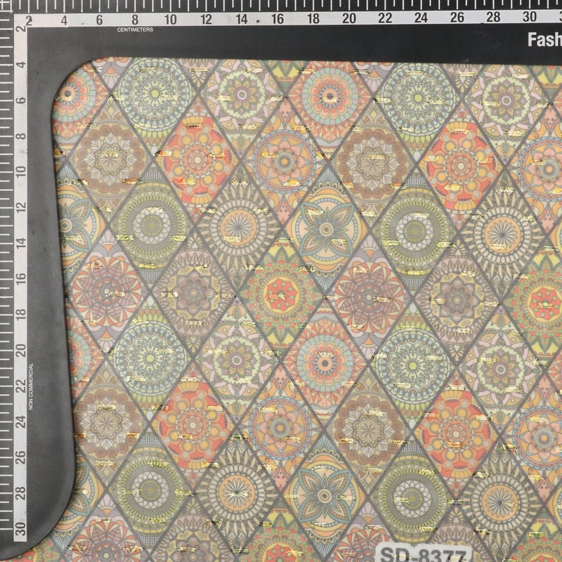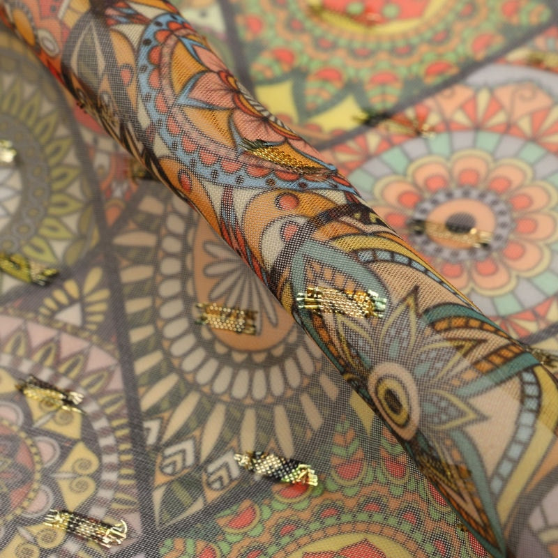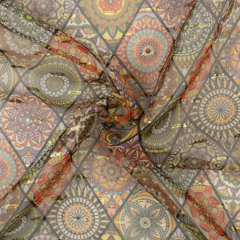 Multi Color Trellis Pattern Digital Print Chiffon With Golden Zari Dobby Fabric