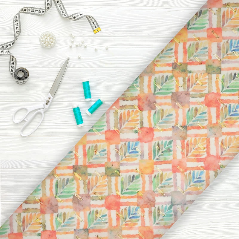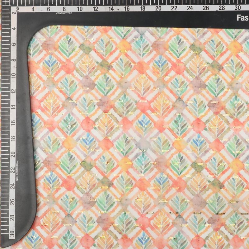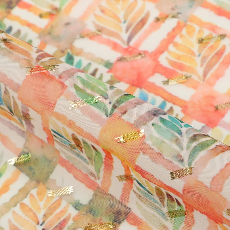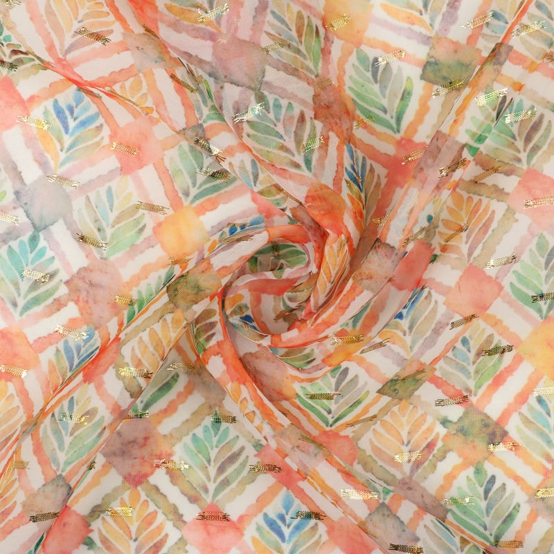 Multi Color Trellis Pattern Digital Print Chiffon With Golden Zari Dobby Fabric