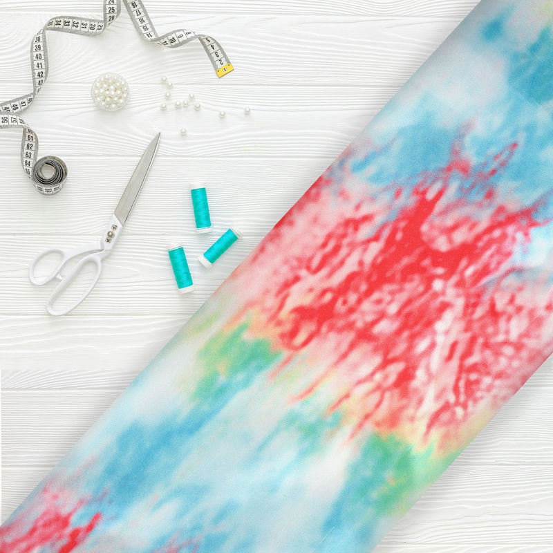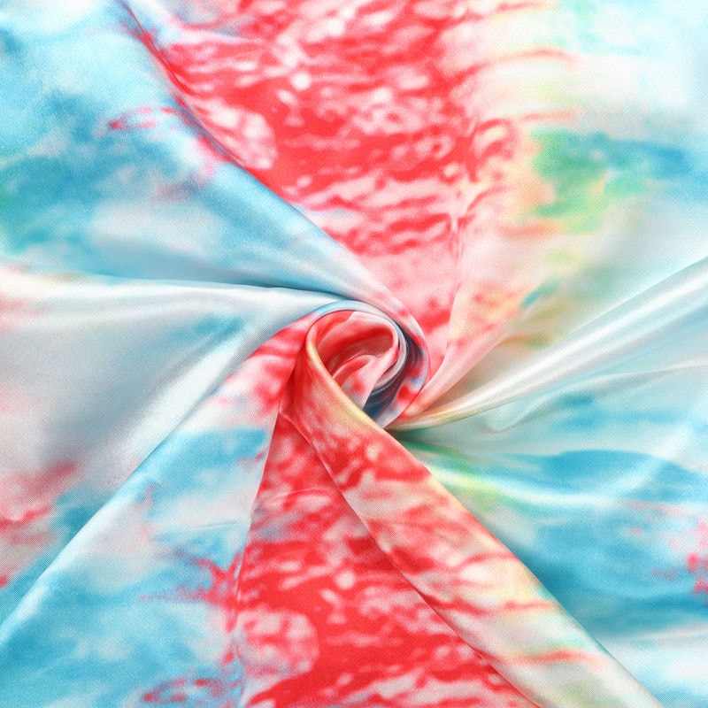 Sky Blue And Red Tie & Dye Pattern Digital Print Ultra Satin Fabric