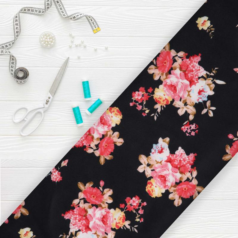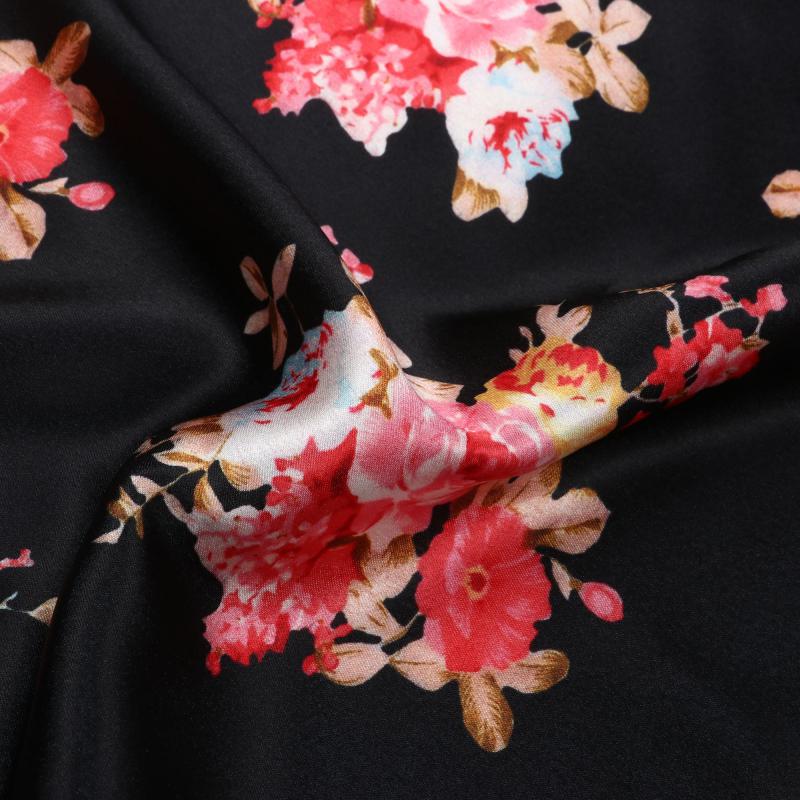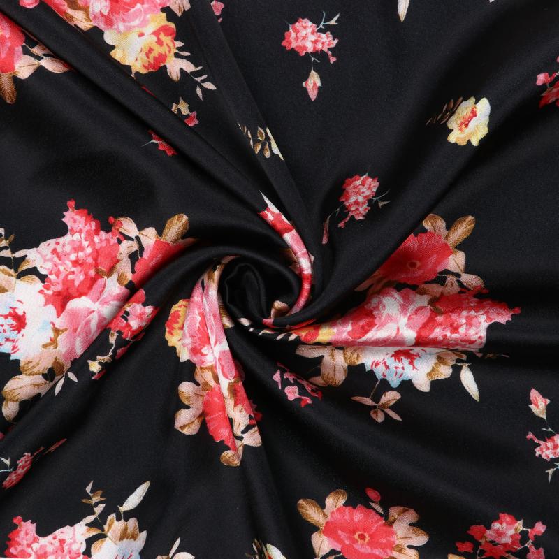 Black And Salmon Red Floral Pattern Digital Print Japan Satin Fabric