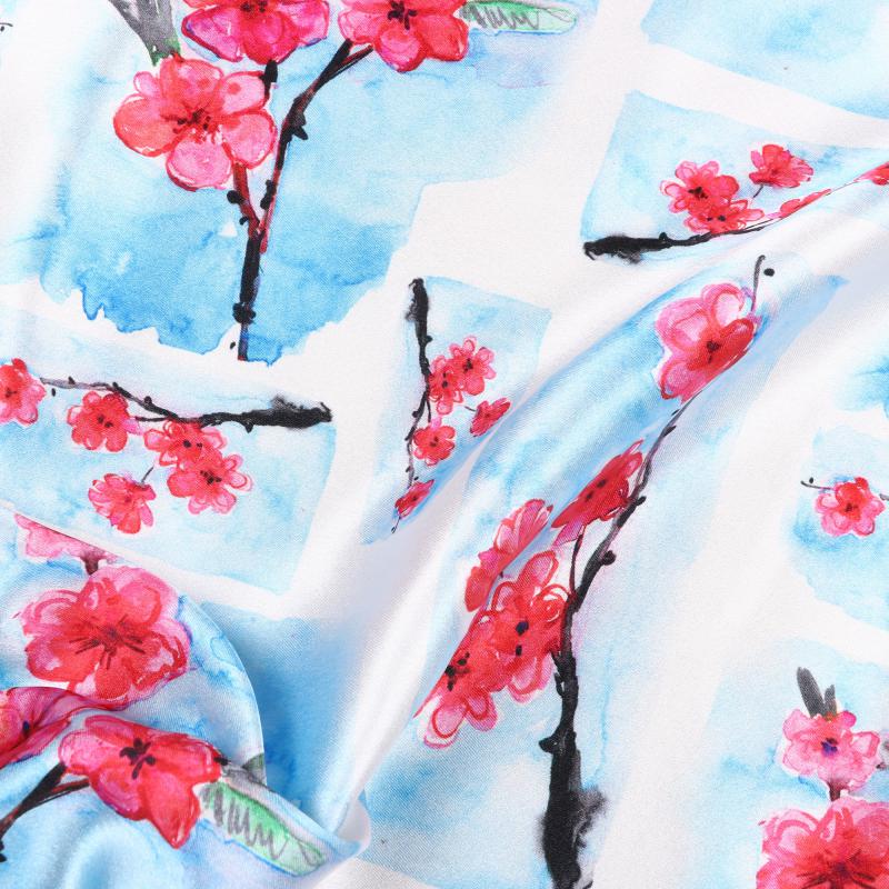 Sky Blue And Salmon Red Floral Pattern Digital Print Japan Satin Fabric