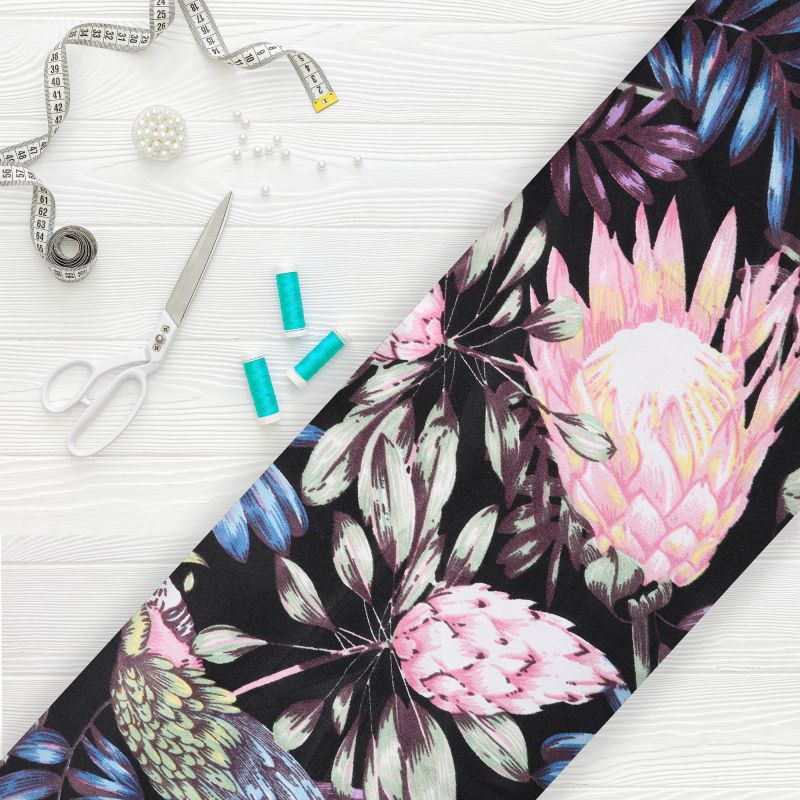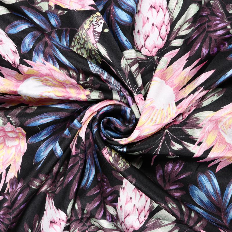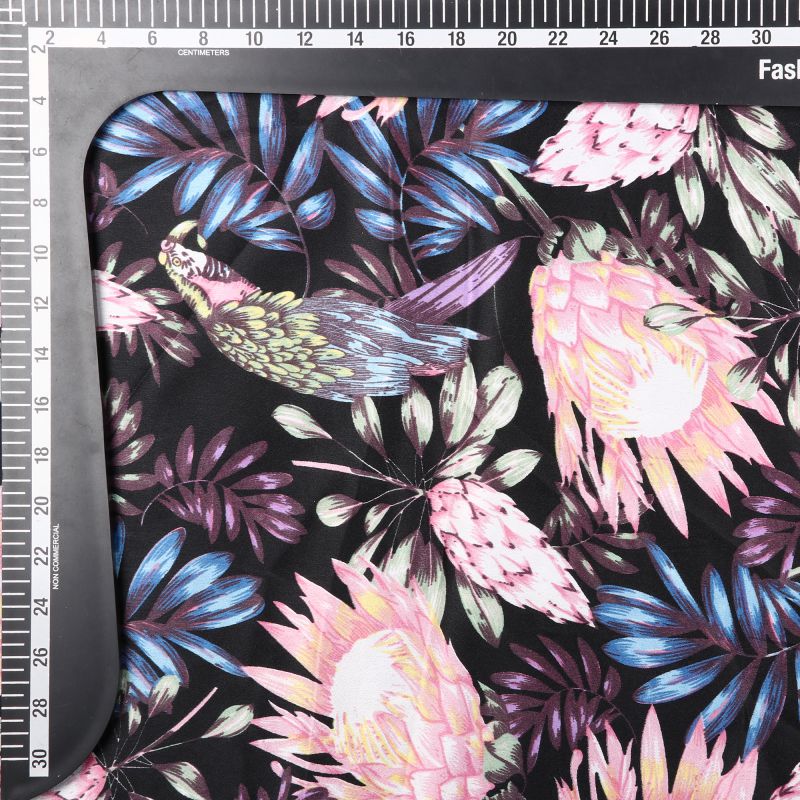 Black And Baby Pink Floral Pattern Screen Print Japan Satin Fabric