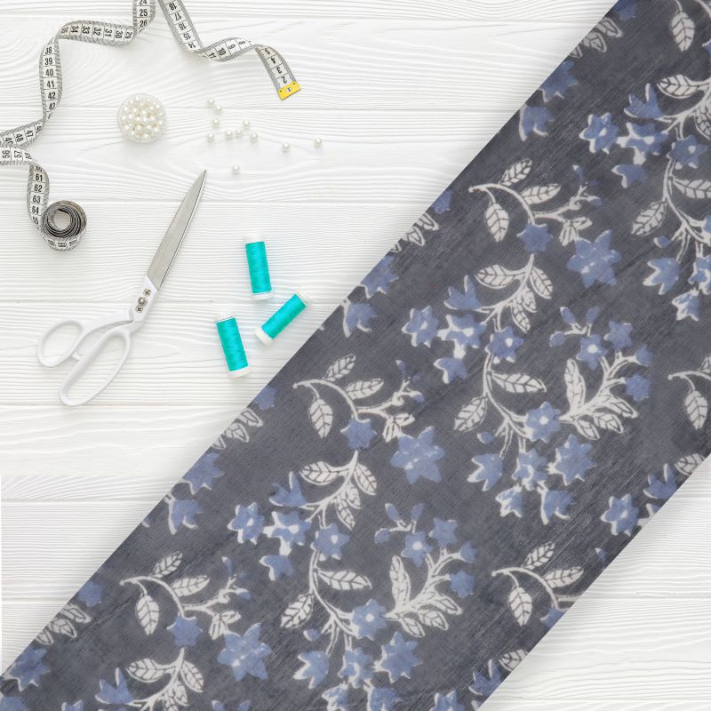 Black And Blue Floral Pattern Digital Print Chanderi Fabric