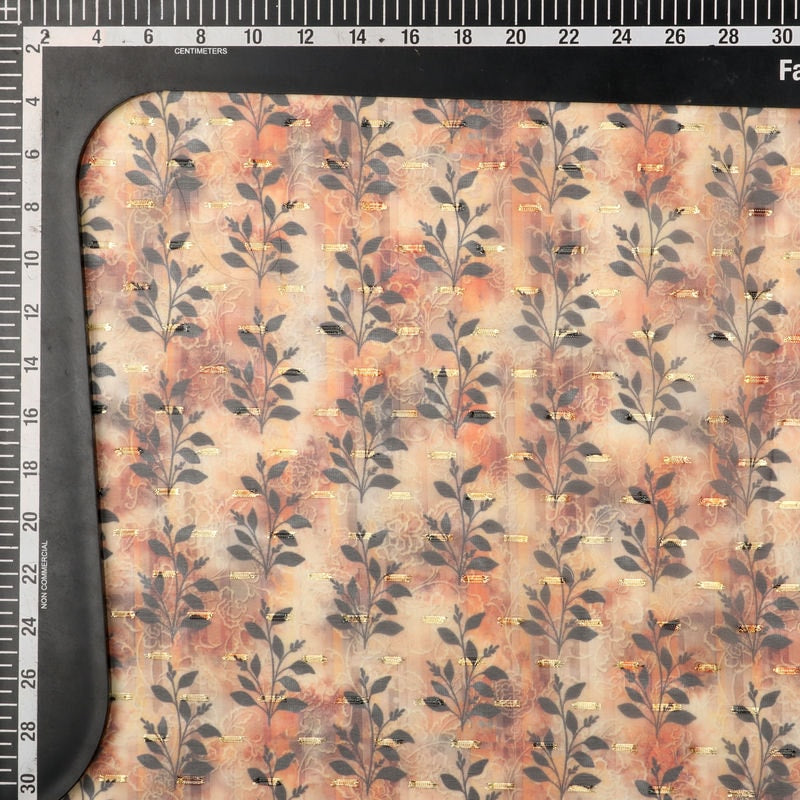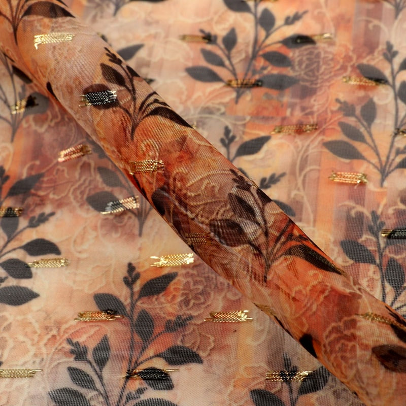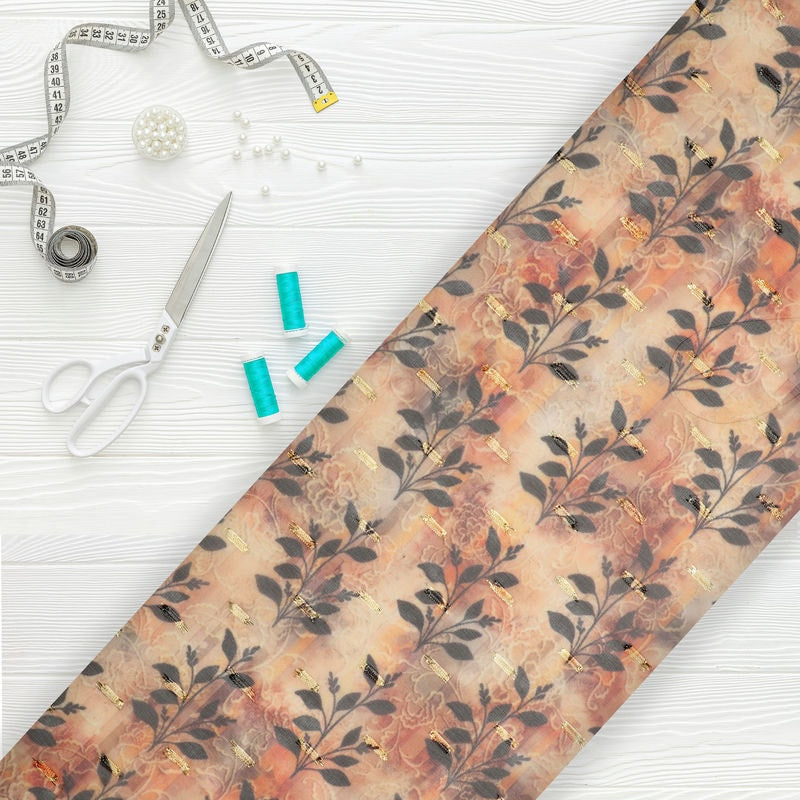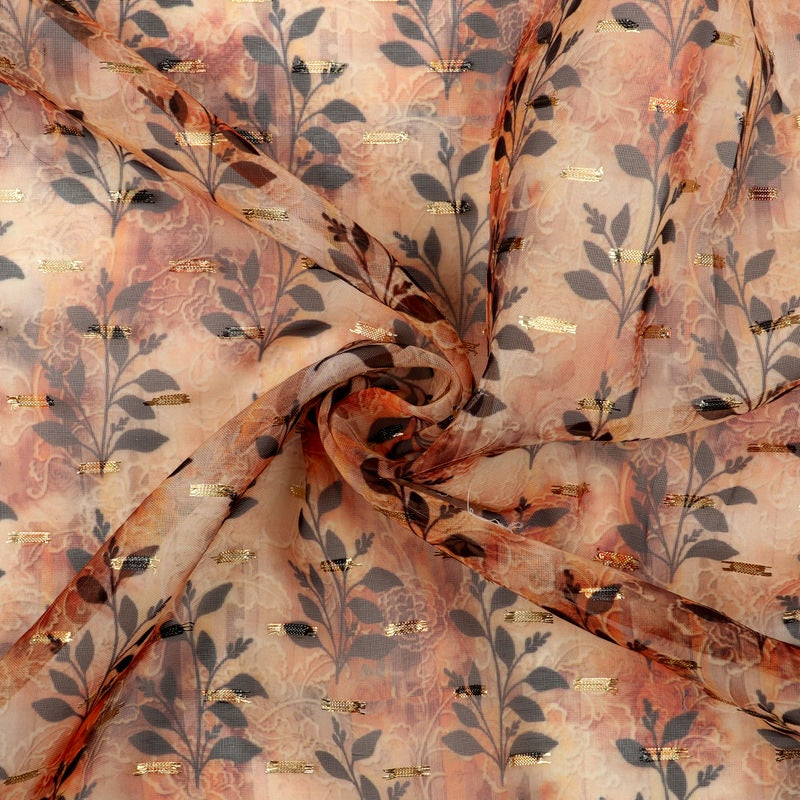 Black And Coffee Brown Floral Pattern Digital Print Chiffon With Golden Zari Dobby Fabric