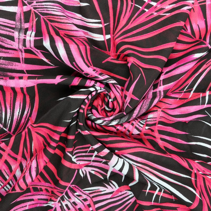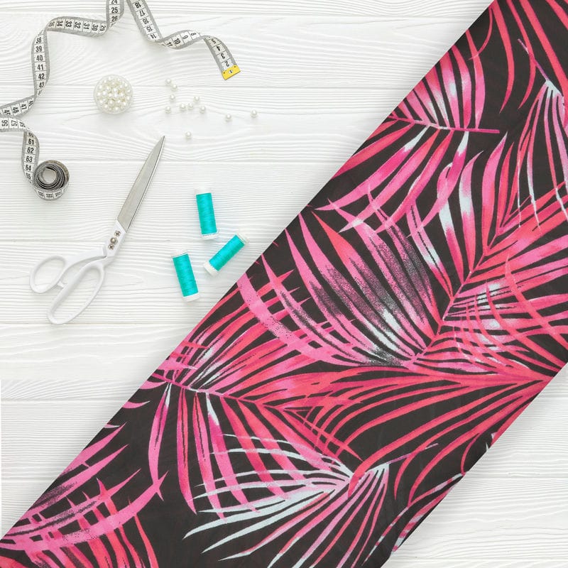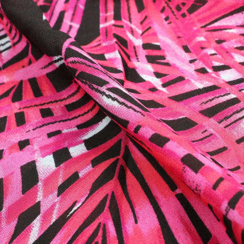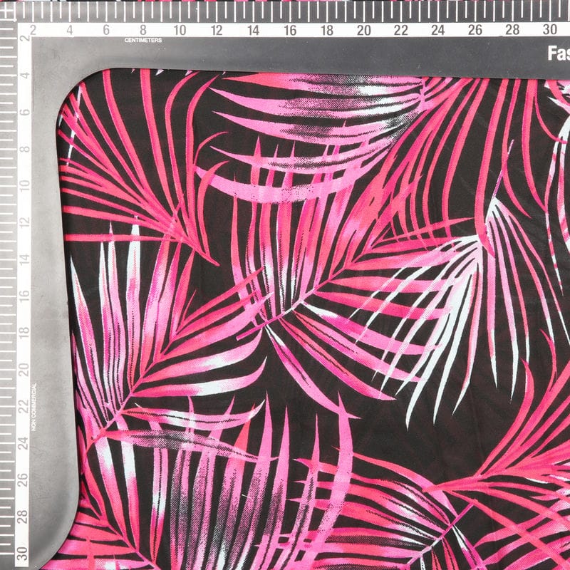Black And Dark Pink Leaf Pattern Screen Print Georgette Fabric