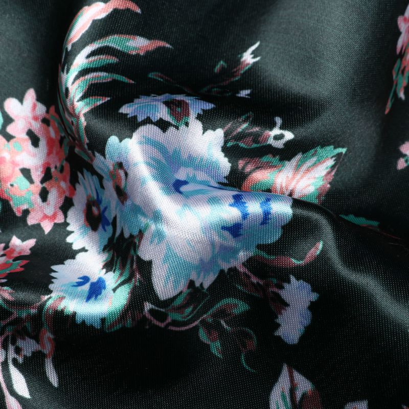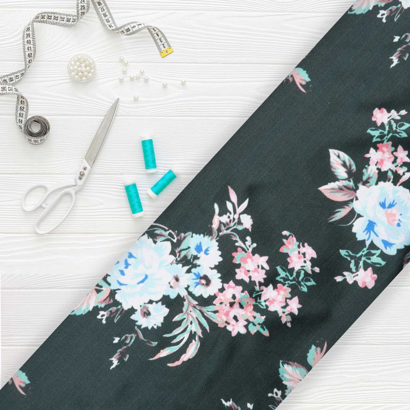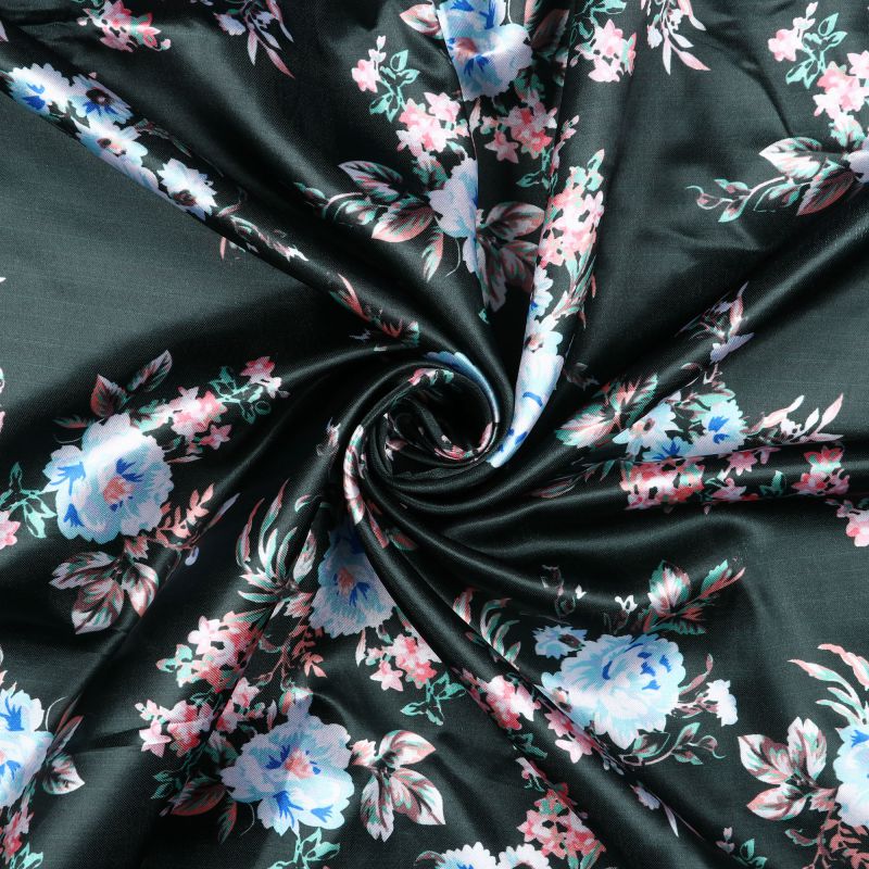 Black And Light Blue Floral Pattern Digital Print Ultra Satin Fabric
