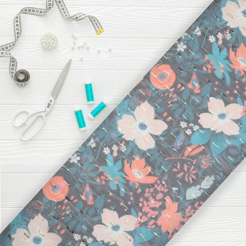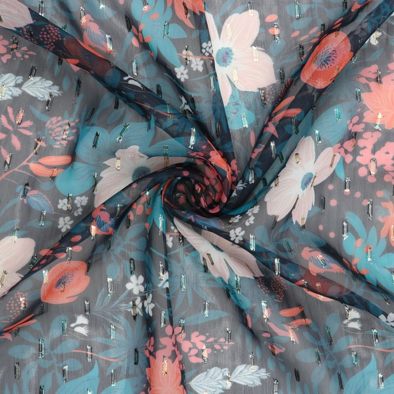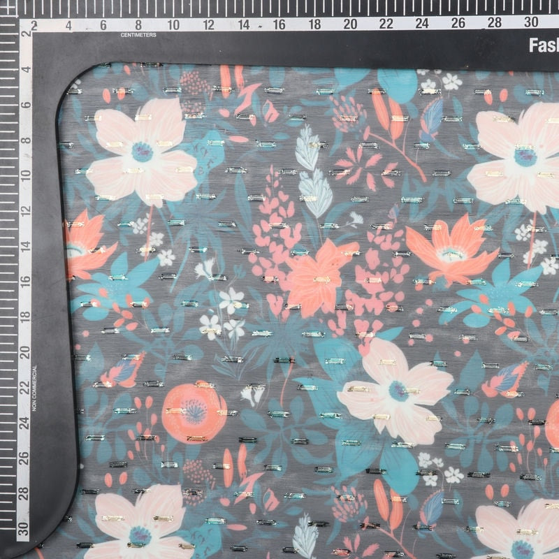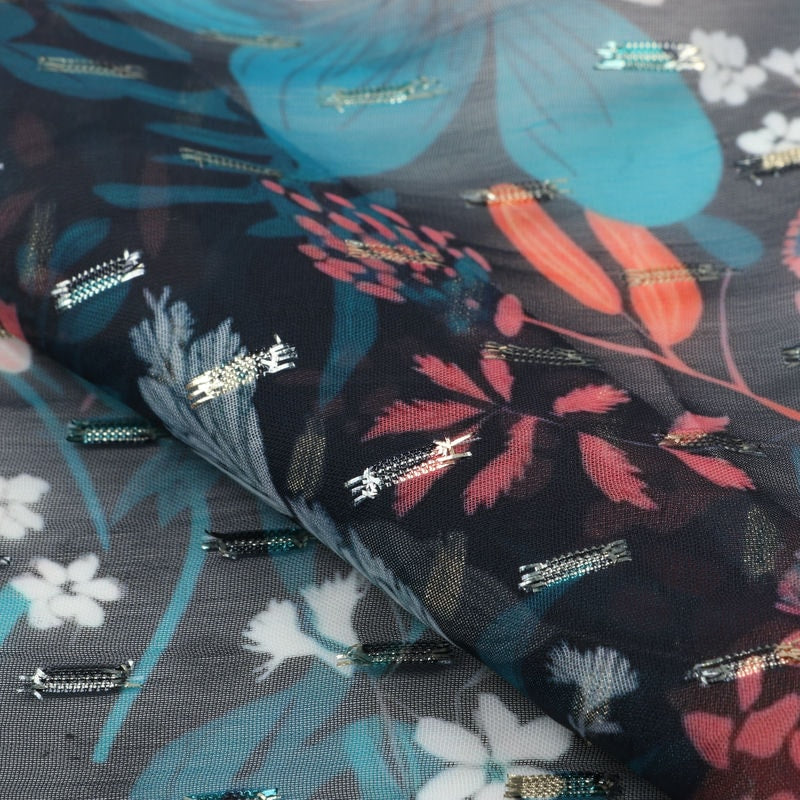 Black And Orange Floral Pattern Digital Print Chiffon Golden Dobby Fabric