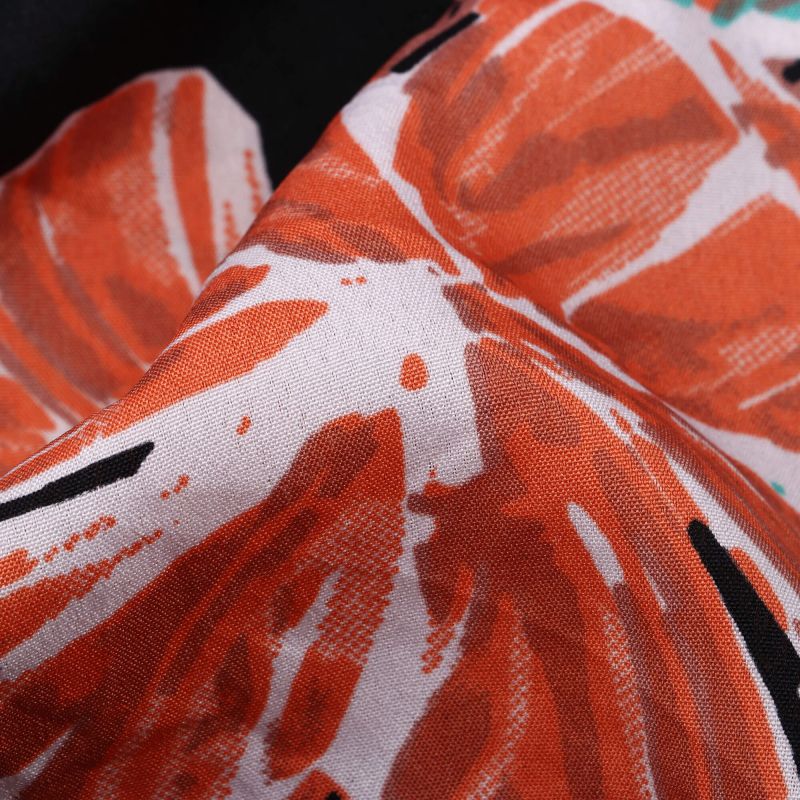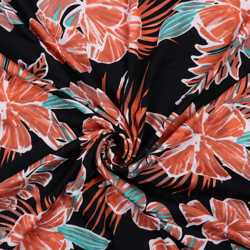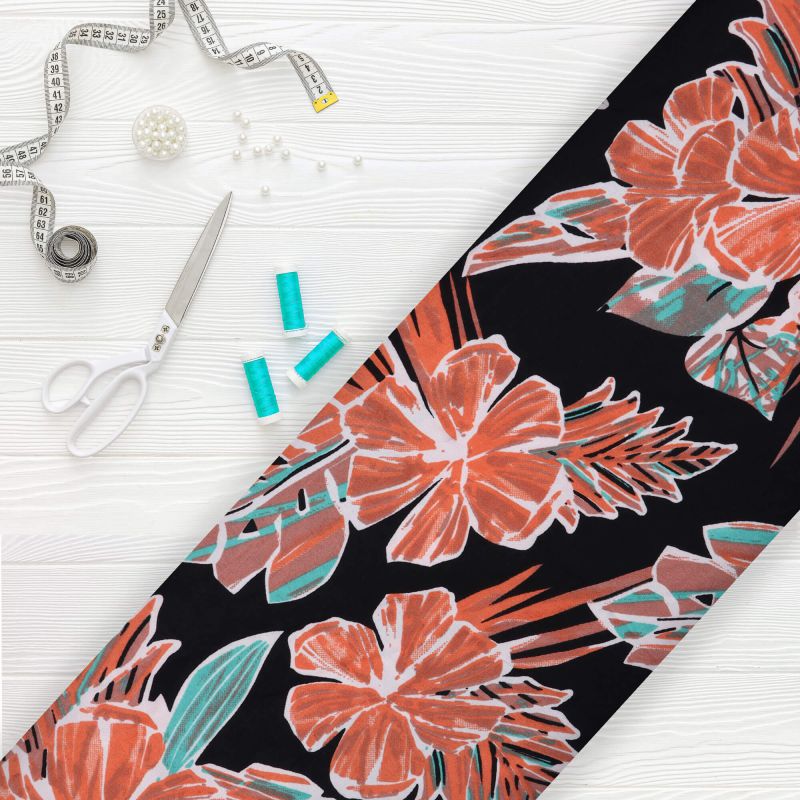 Black And Orange Floral Pattern Screen Print American Crepe Fabric