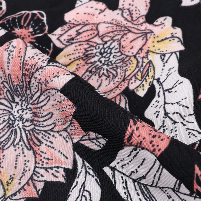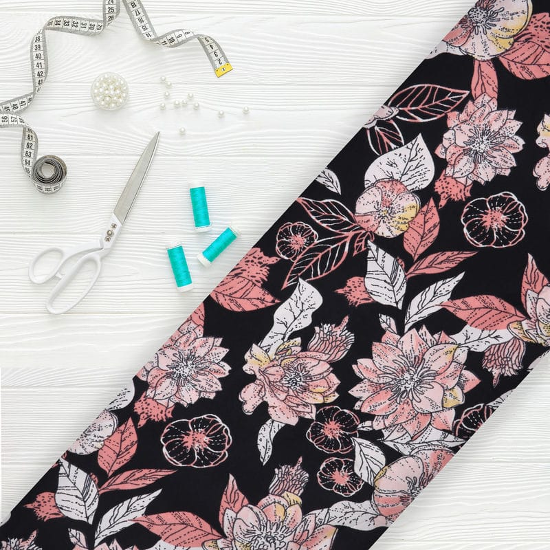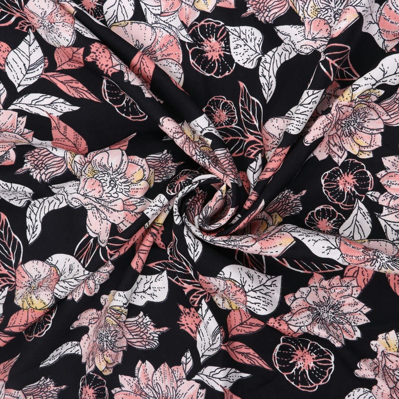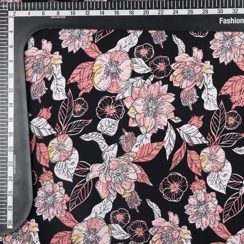 Black And Peach Floral Pattern Screen Print Crepe Fabric