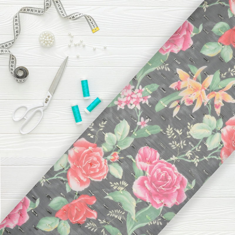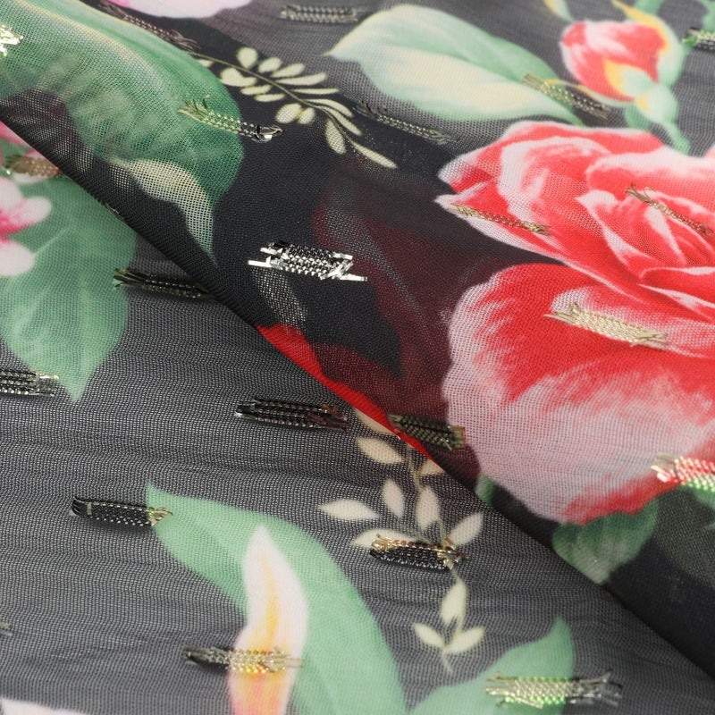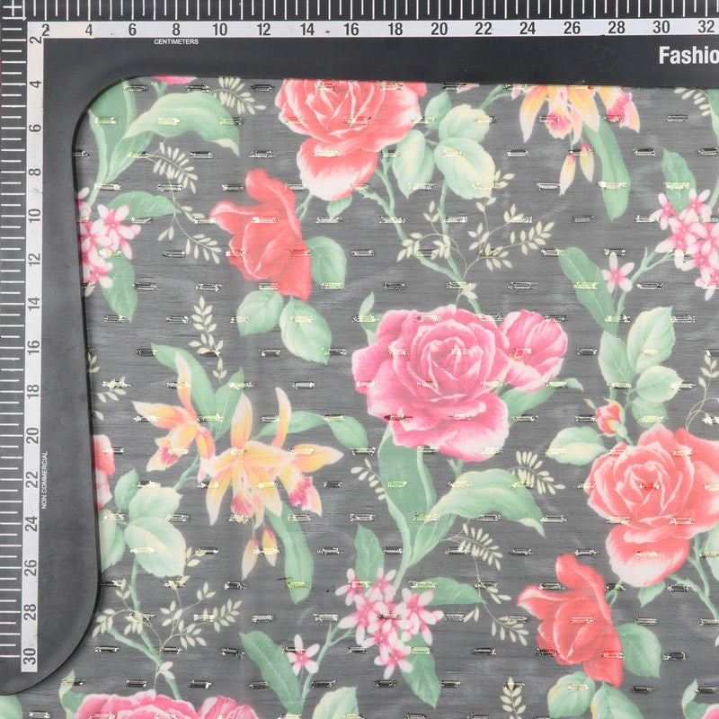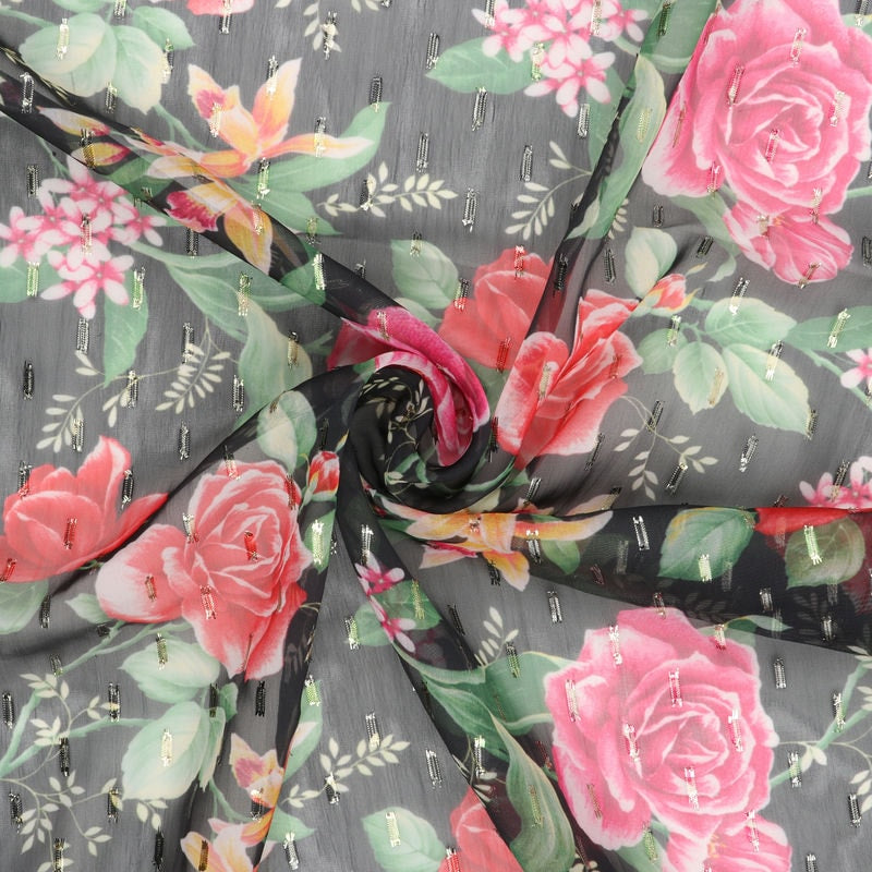 Black And Pink Floral Pattern Digital Print Chiffon Golden Dobby Fabric