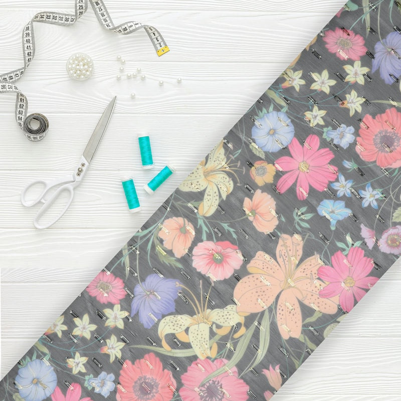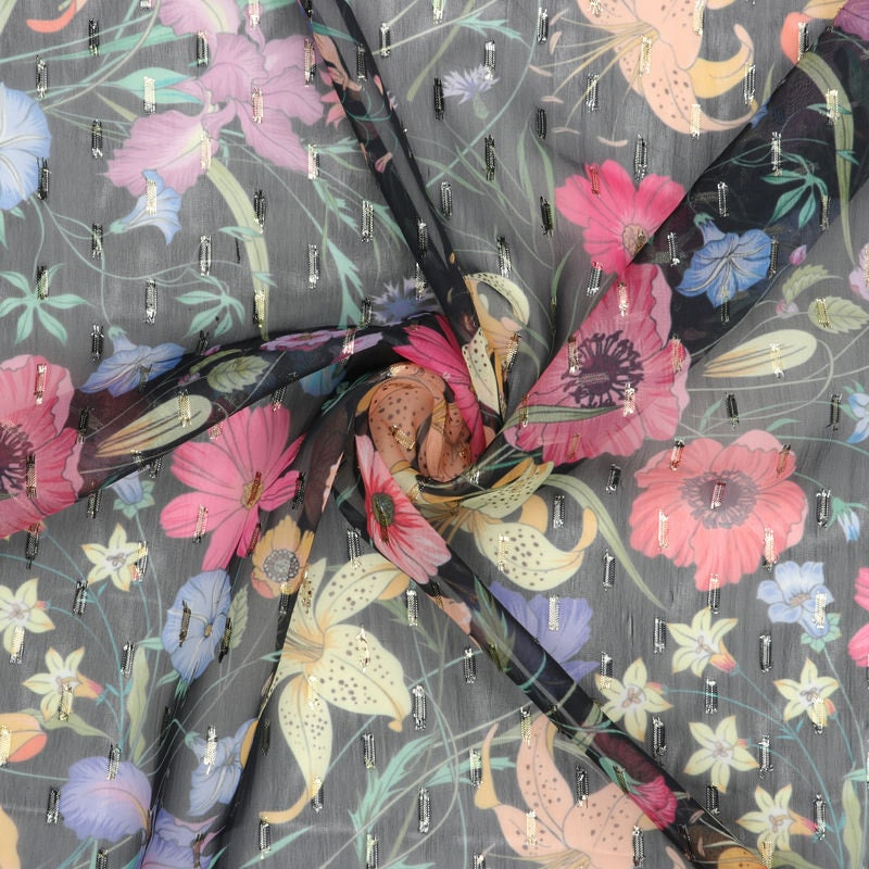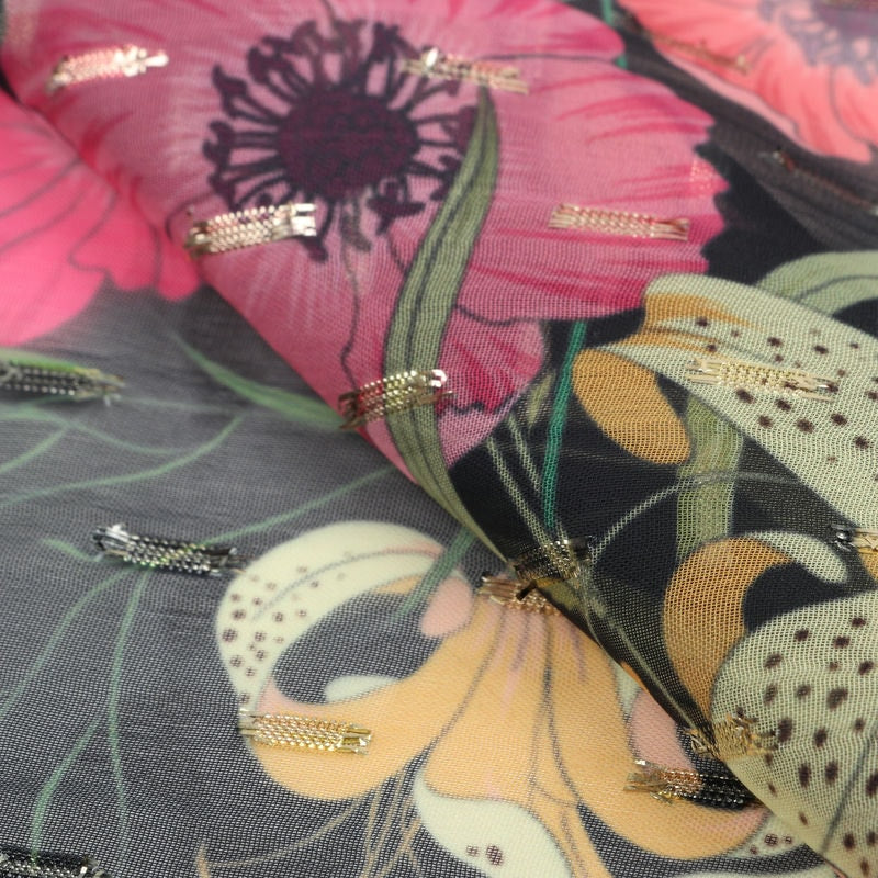 Black And Pink Floral Pattern Digital Print Chiffon Golden Dobby Fabric