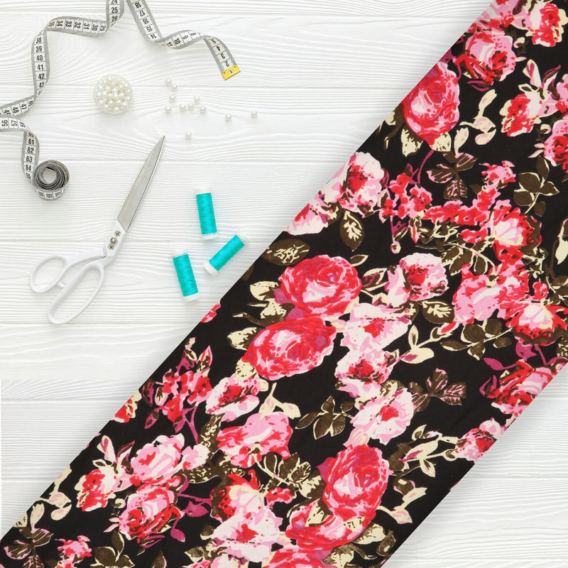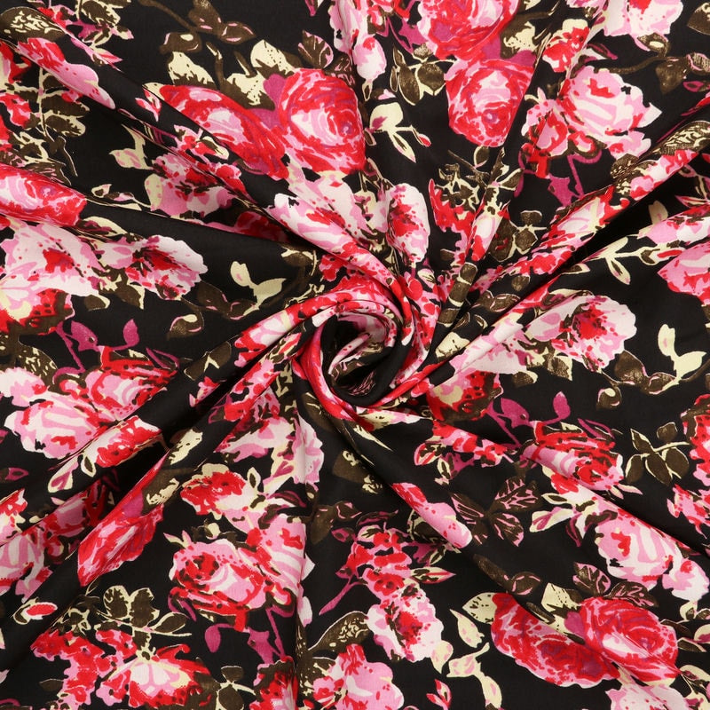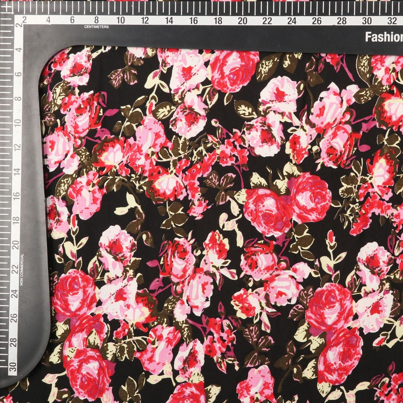 Black And Red Floral Pattern Screen Print Micro Crepe Fabric